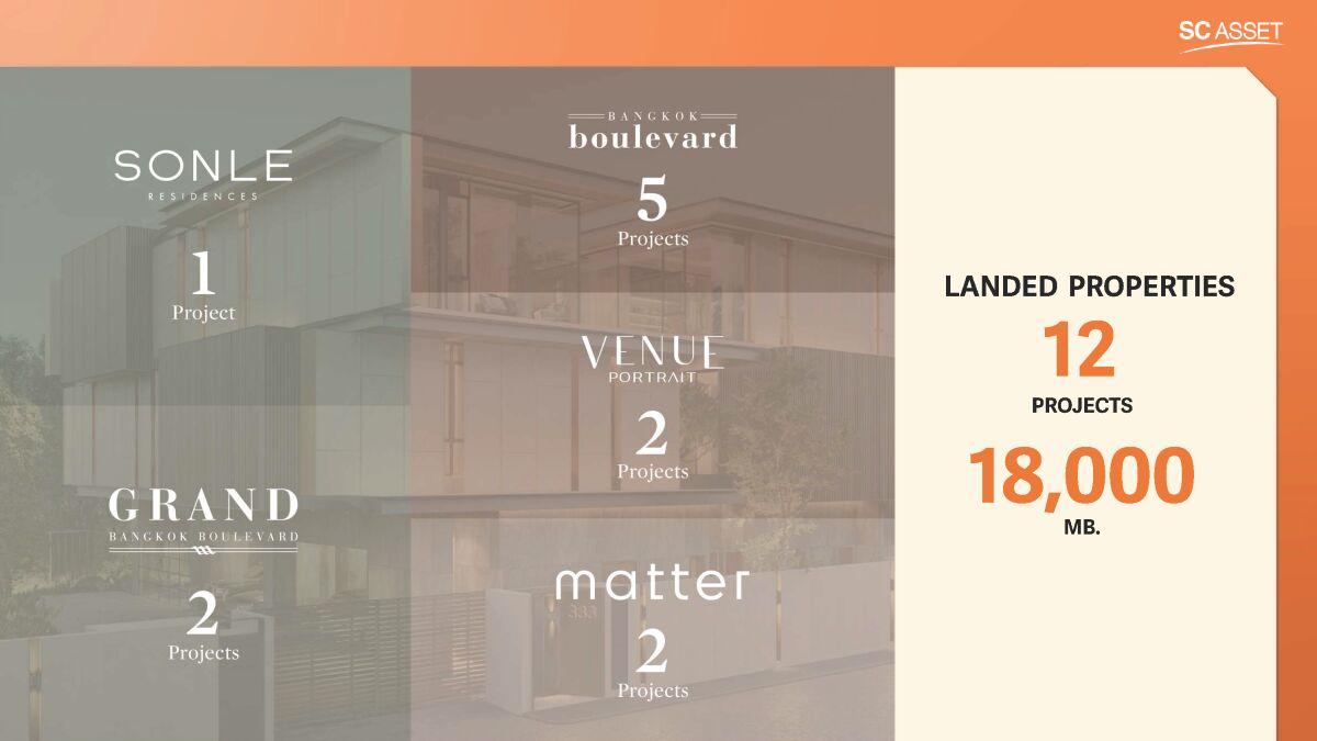 เอสซี แอสเสทครองเบอร์ 1ส่วนแบ่งตลาดกลุ่มบ้านแนวราบ Luxury ราคา 30 ล้านบาทขึ้นไป เดินหน้าเปิด 12 โครงการใหม่ มูลค่ารวม 1.8 หมื่นล้านบาท รองรับเป้ายอดขายปีนี้ 18,800 ล้านบาท ชูไฮไลต์ 2 แบรนด์ใหม่ “ซันเล เรสซิเดนเซส ราคา 200 ล้านบาทขึ้นไปและแบรนด์ Matter ประเดิมไตรมาสแรกเปิดแกรนด์ บางกอก บูเลอวาร์ด สุขสวัสดิ์–พระราม 3 คฤหาสน์หรูสไตล์ Empire กวาดยอดขายแล้วกว่า 900 ล้านบาท