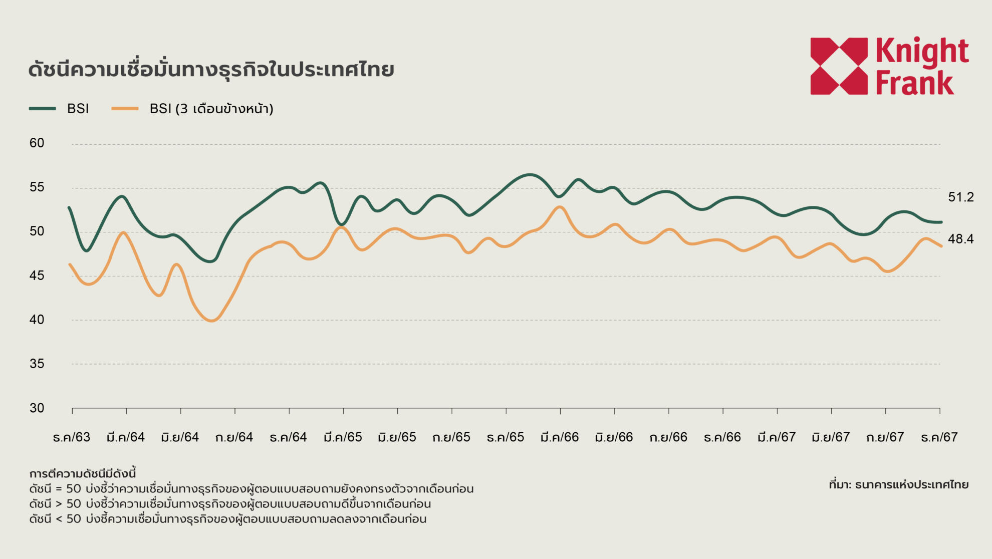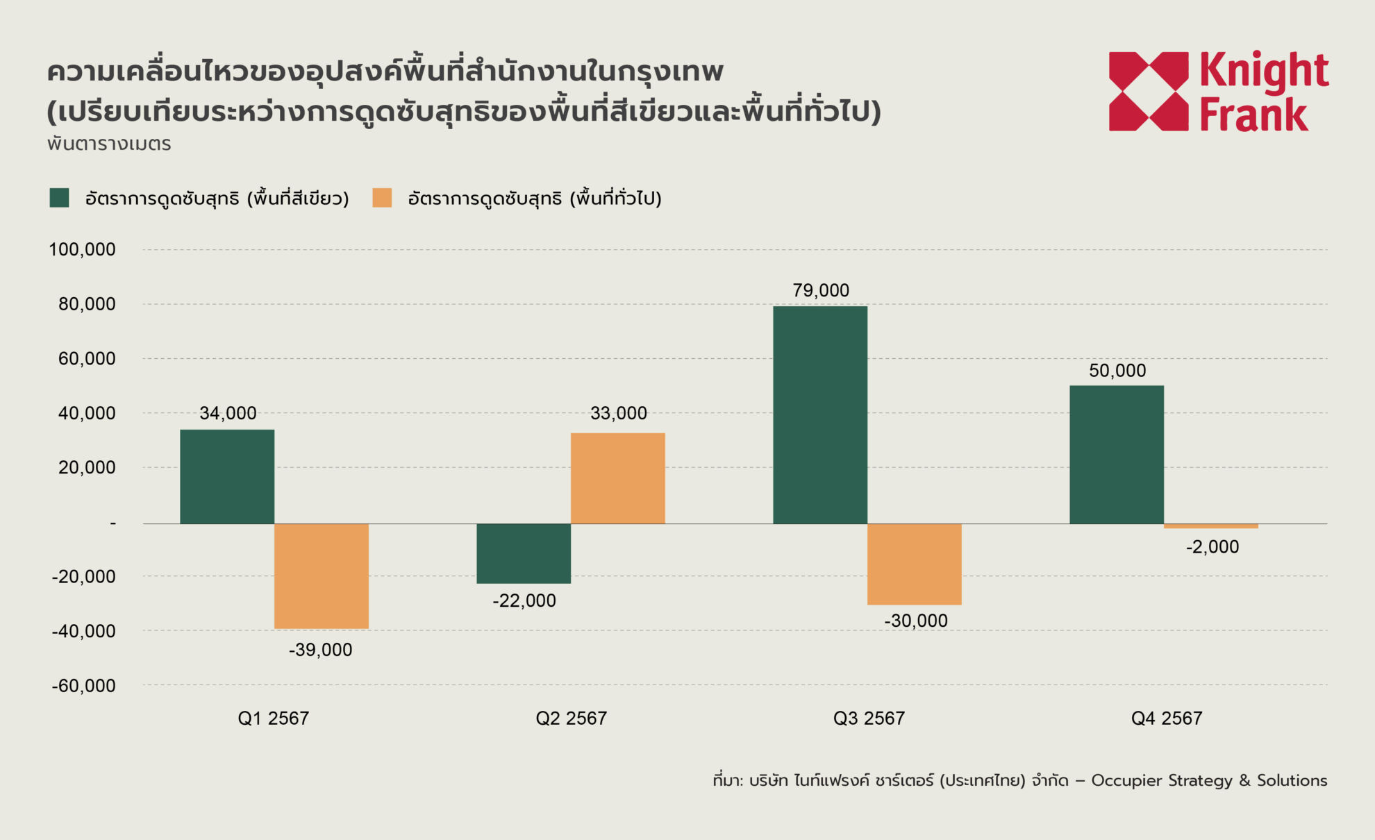 ในไตรมาสล่าสุด ตลาดสำนักงานในกรุงเทพฯ มีจำนวนพื้นที่คงที่ที่ 6.31 ล้านตารางเมตร เนื่องจากไม่มีการเพิ่มหรือลดของซัพพลาย ในปี 2567 ที่ผ่านมา ตลาดมีการเพิ่มซัพพลายรวม 235,000 ตารางเมตร ซึ่งใกล้เคียงกับอัตราในปีที่ผ่านมา ขณะที่การปรับขนาดโครงการในอนาคตทำให้ปริมาณซัพพลายในอนาคตลดลงเหลือ 1.0 ล้านตารางเมตร การเช่าพื้นที่ยังคงดำเนินไปอย่างแข็งแกร่ง โดยมีอัตราการดูดซับสุทธิ ที่ 48,000 ตารางเมตร ส่งผลให้พื้นที่ที่ถูกใช้งานเพิ่มขึ้น 1% เป็น 4.86 ล้านตารางเมตร น่าสังเกตคือ อาคารที่ได้รับการรับรองมาตรฐานด้านสิ่งแวดล้อม สามารถดึงดูดความต้องการได้มาก โดยมีอัตราการดูดซับสุทธิที่ 50,000 ตารางเมตร เทียบกับการลดลงเล็กน้อยของอาคารที่ไม่ใช่ประเภทดังกล่าว ทั้งในพื้นที่ศูนย์กลางธุรกิจ และนอกศูนย์กลางธุรกิจ มีแนวโน้มที่ดี โดยมีอัตราการดูดซับสุทธิที่ 27,000 ตารางเมตร และ 22,000 ตารางเมตร ตลาดกำลังก้าวเข้าสู่ช่วงเวลาที่มีความเปลี่ยนแปลงอย่างมาก เนื่องจากมีแรงกดดันด้านซัพพลายที่สูงและความต้องการที่พัฒนาไป คาดว่าในปี 2568 จะมีการเพิ่มพื้นที่ใหม่ถึง 540,000 ตารางเมตร ซึ่งถือว่าเป็นจำนวนสูงสุดในอนาคตอันใกล้ เจ้าของอสังหาริมทรัพย์จึงจำเป็นต้องวางกลยุทธ์เพื่อให้ทรัพย์สินของตนสามารถแข่งขันได้ โดยอาคารเกรด A มีแนวโน้มที่จะได้ประโยชน์จากสถานะระดับพรีเมียม เนื่องจากความนิยมของผู้เช่าที่เน้นคุณภาพสูง สิ่งอำนวยความสะดวกครบครัน และการผสานโครงสร้างพื้นฐานด้านดิจิทัลที่ทันสมัย