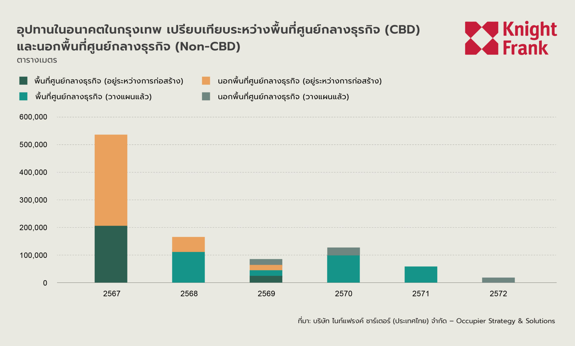 พื้นที่ให้เช่ารวมในโครงการที่อยู่ระหว่างการพัฒนาได้ลดลงเหลือ 1.0 ล้านตารางเมตร ซึ่งสะท้อนถึงการปรับขนาดโครงการในอนาคตให้สอดคล้องกับสภาวะตลาดปัจจุบัน ขณะนี้มีพื้นที่ก่อสร้างอยู่ประมาณ 530,000 ตารางเมตร ทั้งนี้ คาดการณ์ว่าในปี 2025 จะมีปริมาณอุปทานเข้าสู่ตลาดมากที่สุด โดยคาดว่าจะมีการเพิ่มพื้นที่เช่ารวม 540,000 ตารางเมตร