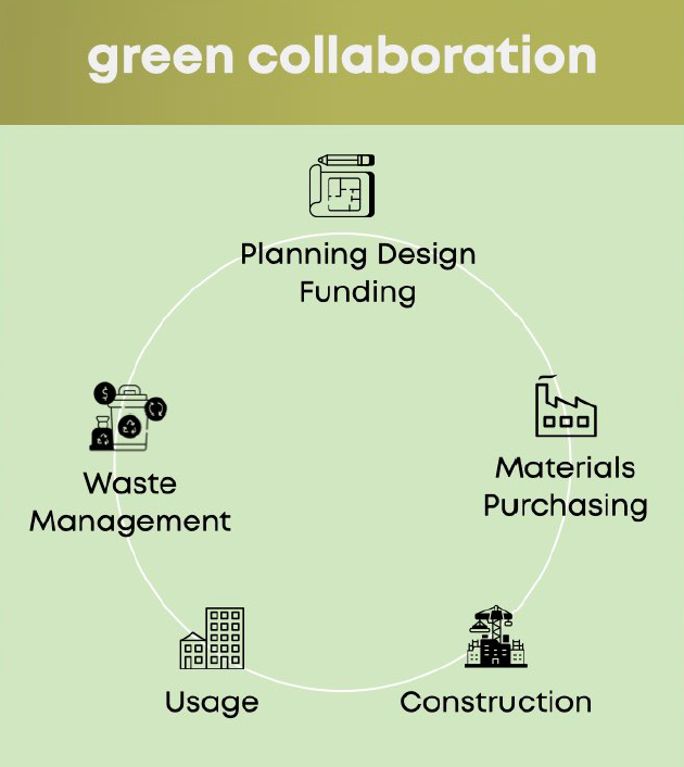 green collaboration: ร่วมมือกับพันธมิตรทางธุรกิจ ลดการปล่อย GHG ในทุกขั้นตอนของการพัฒนาอสังหาฯ ครอบคลุมตั้งแต่การหาเงินทุน การออกแบบ การจัดซื้อ การก่อสร้าง ไปจนถึงการจัดการของเสียอย่างเป็นระบบ ภายใน 5 ปีนี้ มากกว่า 95% ของมูลค่าการจัดซื้อ จะมาจากวัสดุที่เป็นมิตรต่อสิ่งแวดล้อม