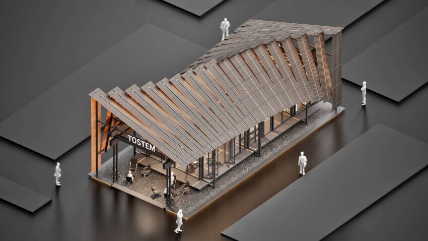 ภากร มหพันธ์ สถาปนิกจากบริษัท เอ็มสเปซ จำกัด กล่าวว่า โดยการออกแบบบูธ TOSTEM ในปีนี้ได้รับแรงบันดาลใจจากประตูบานเลื่อนภายในที่ใช้เชื่อมโยงพื้นที่ใน Traditional Japanese Room ซึ่งห้องหลายๆ ห้องสามารถเชื่อมต่อกันได้อย่างไร้รอยต่อ โครงสร้างของบูธถูกออกแบบให้เป็น Series of sections ที่ค่อยๆ บิดจากหลังคาทรงจั่วบริเวณกลางอาคาร และเปลี่ยนรูปเป็นผนังที่ปลายทั้งสองด้าน ก่อให้เกิดรูปแบบของพื้นที่ที่เปลี่ยนแปลงไปอย่างต่อเนื่องในทุกระยะ 1 เมตร โดยตั้งอยู่บนโครงสร้างของ Tatami Room ที่มั่นคง ให้ลูกค้าได้สัมผัสประสบการณ์ในการเข้าชมพื้นที่ ได้สัมผัสประสบการณ์ในการเข้าชมพื้นที่จัดแสดงผลิตภัณฑ์ TOSTEM อย่างไร้รอยต่อ