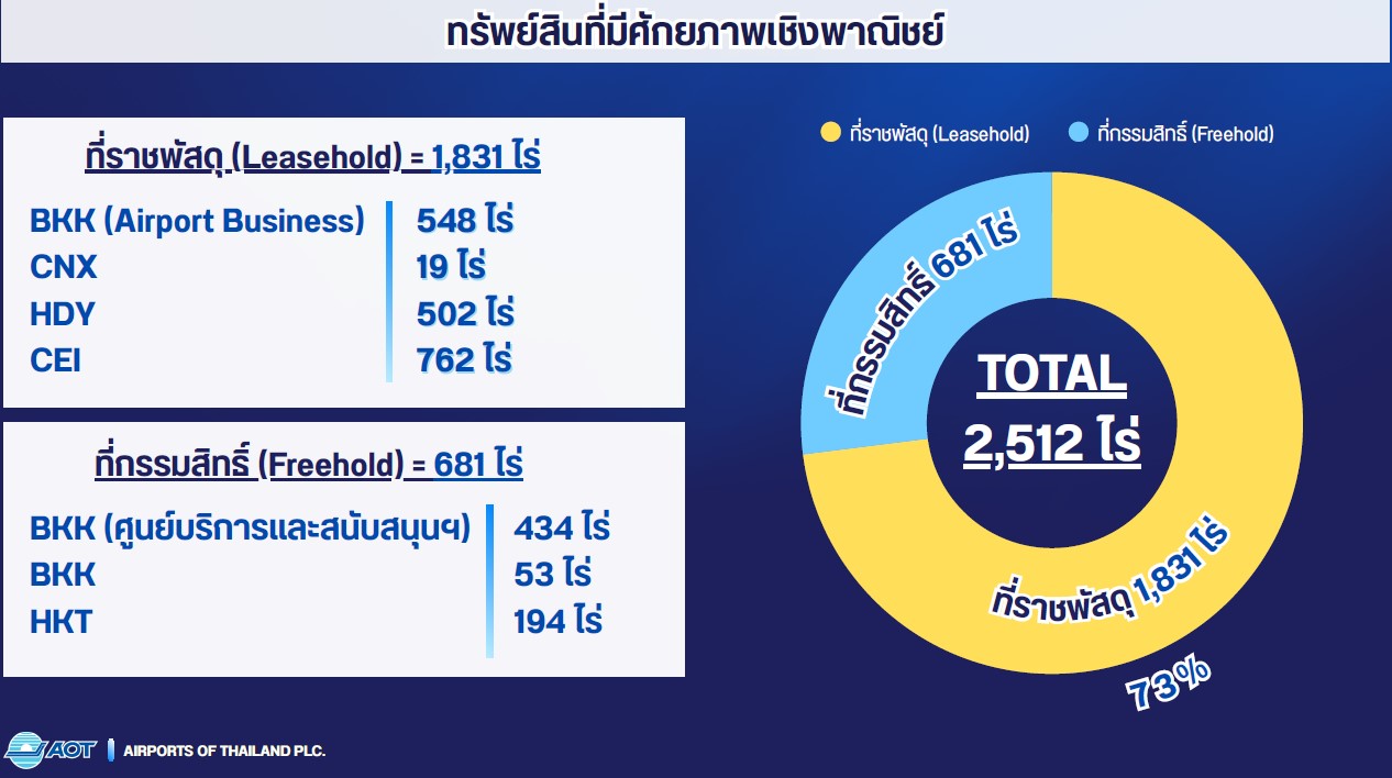 สำหรับแปลงที่ดินโดยรอบสนามบินทั้ง 6 แห่ง ส่วนใหฯญ่จะเป็นพื้นที่ของราชพัสดุ Leasehold ที่ AOT เช่าจากกรมธนารักษ์ประมาณ 73% ส่วนที่เหลือเป็นพื้นที่กรรมสิทธิ์แบบ Freehold ที่ AOT ถือกรรมสิทธิ์เอง ประกอบด้วย