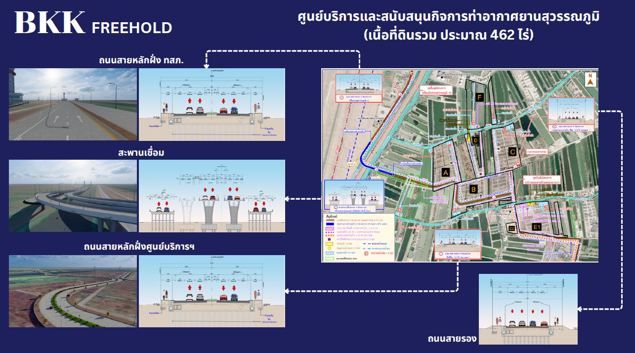 ส่วนแปลงศูนย์บริการและสนับสนุนกิจการท่าอากาศยาน ซึ่งเป็นที่ดิน Freeholdจำนวน 7 แปลง ขนาดพื้นที่รวม 462 ไร่ จะมีถนนและสะพานยกระดับเชื่อมจากภายนอกเข้าสู่ท่าอากาศยานสุวรรณภูมิ สามารถเข้าออกผ่านทาง ถนนลาดกระบัง-วัดศรีวารีน้อยได้ด้วยถนน 4 เลน และห่างจากอาคารผู้โดยสารเพียง 15 นาที เหมาะสำหรับการ พัฒนาเป็น Logistics & Transportation Hub ศูนย์จัดการสินค้าเกษตร Hotel & Residential Area