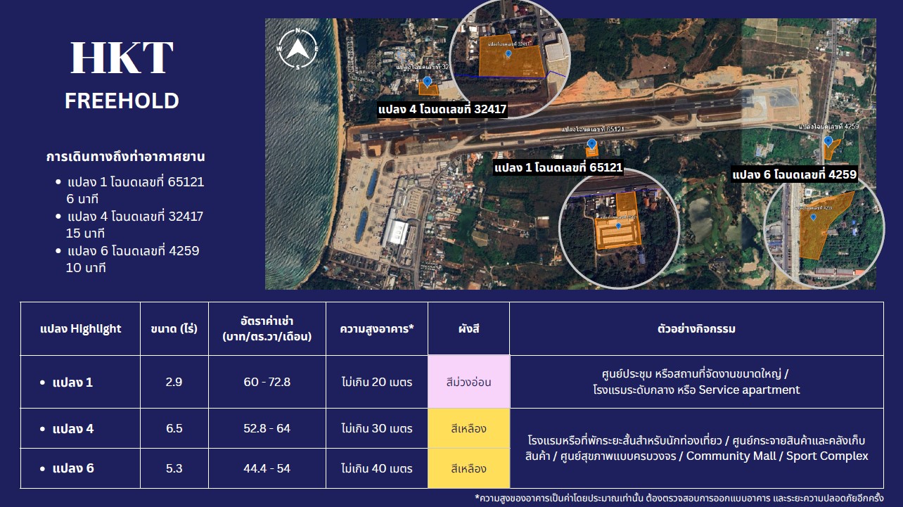- ท่าอากาศยานภูเก็ต (HKT) มีที่ดินทั้งหมด 7 แปลง รวม 192 ไร่ (Freehold) ใกล้ถนนเทพกษัตรี –