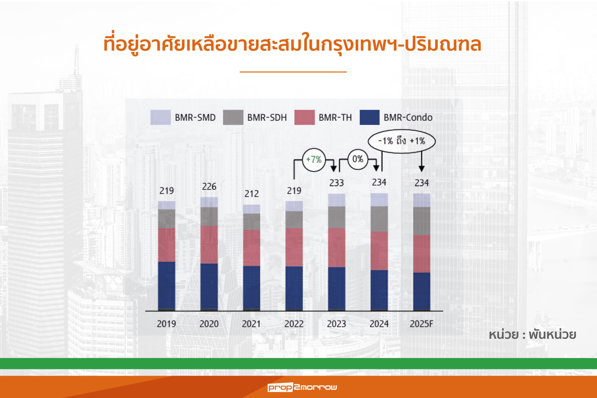 อย่างไรก็ตามแม้อุปทานใหม่ในปี 2568 จะยังมีแนวโน้มหดตัว แต่อุปสงค์ทก็หดตัวลงเช่นกัน ส่งผลให้หน่วยที่อยู่อาศัยเหลือขายสะสมในปีนี้ ยังมีแนวโน้มทรงตัว โดยกลุ่มบ้านเดี่ยวและบ้านแฝดระดับราคาปานกลางขึ้นไปยังต้องใช้ระยะเวลาดูดซับจากอุปสงค์ที่ยังมีอยู่จำกัด ส่วนกลุ่มที่อยู่อาศัยระดับราคาปานกลาง-ล่าง ที่แม้จะมีการเปิดโครงการใหม่อย่างระมัดระวัง แต่ยังต้องติดตามสถานการณ์การถูกปฏิเสธสินเชื่อ หรือยกเลิกการซื้อ Pre-sale โครงการคอนโดฯที่มีแผนจะก่อสร้างเสร็จพร้อมส่งมอบในช่วง 1-3 ปีข้างหน้า ที่จะเป็นอีกปัจจัยเสี่ยงที่ทำให้หน่วยที่อยู่อาศัยเหลือขายสะสมเร่งตัวเพิ่มขึ้น