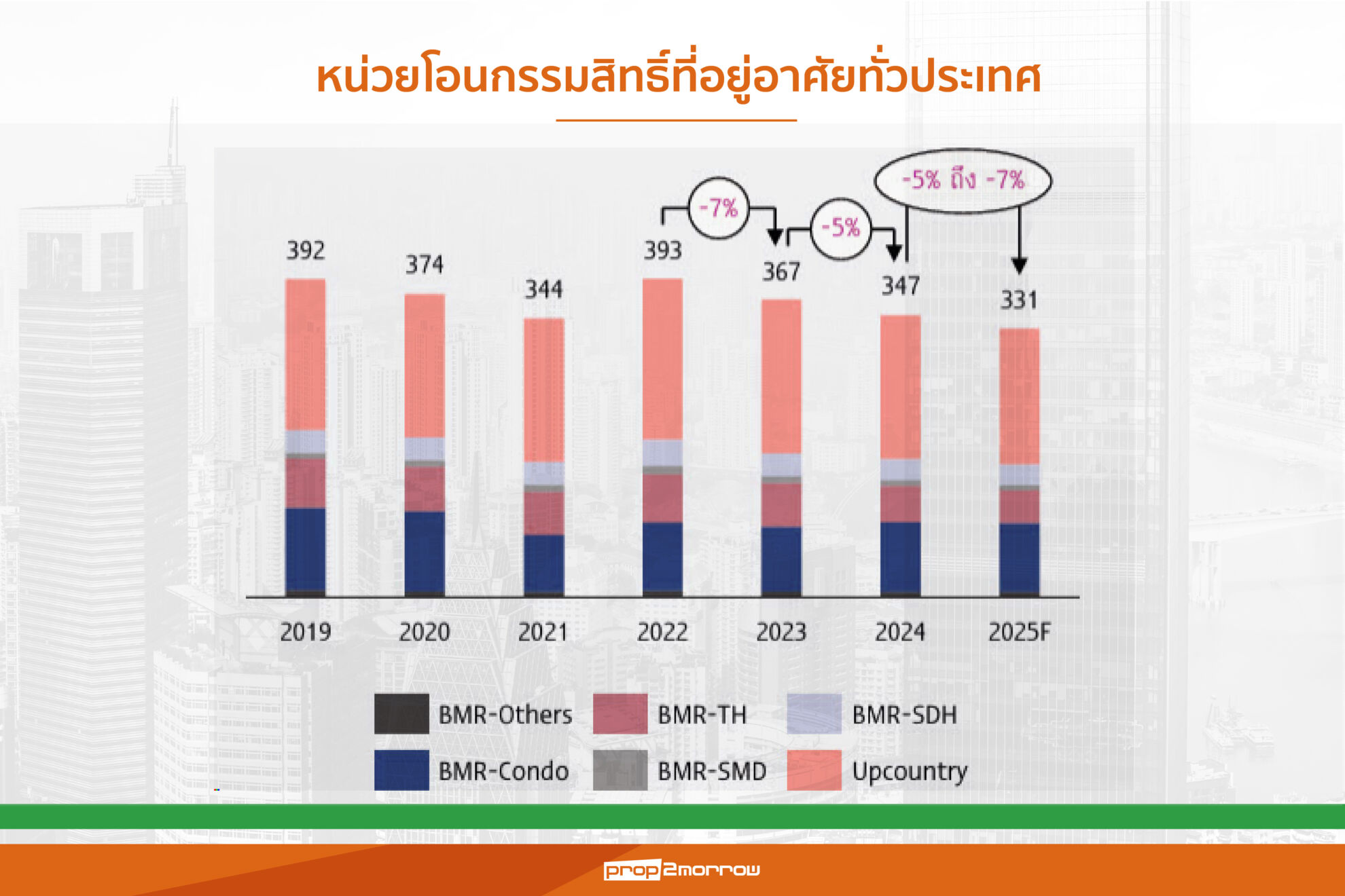 ส่วนการก่อสร้างและเปิดใช้รถไฟฟ้าสายใหม่ รวมถึงการลงทุนโครงสร้างพื้นฐานด้านการคมนาคมขนาดใหญ่ ทั้งในกรุงเทพฯ และปริมณฑล รวมถึงต่างจังหวัด จะเป็นการเปิดโอกาสให้สามารถพัฒนาโครงการใหม่ ๆ ในหลากหลายทำเลได้มากขึ้น แต่จากปัจจัยกดดันที่ยังมีน้ำหนักมากกว่าปัจจัยสนับสนุน ส่งผลให้ SCB EIC คาดว่า หน่วยโอนกรรมสิทธิ์ทั่วประเทศในปี 2025 จะหดตัวประมาณ -5-7% ส่วนมูลค่าโอนกรรมสิทธิ์ทั่วประเทศในปี 2568 มีแนวโน้มหดตัว -3% ถึง -5% โดยเฉพาะการโอนกรรมสิทธิ์ในต่างจังหวัดมีแนวโน้มหดตัวในอัตราที่สูงกว่ากรุงเทพฯ และปริมณฑลเล็กน้อย เนื่องจากมีสัดส่วนกำลังซื้อกลุ่มรายได้ปานกลาง-ล่าง ซึ่งได้รับผลกระทบจากปัจจัยทางเศรษฐกิจที่สูงกว่า