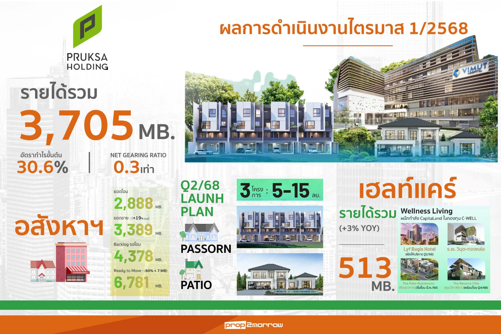 พฤกษา โฮลดิ้งเผยรายได้รวมไตรมาส 1 ปี 2568 แตะ 3,705 ล้านบาท รายได้หลักมาจากยอดโอนที่อยู่อาศัย 2,888 ล้านบาทหลังเปิดเกมรุกอสังหาฯ ครบเซ็กเมนต์ พร้อมผนึกกำลังด้านธุรกิจเฮลท์แคร์ เดินหน้าสู่ผู้นำเวลเนส เรสซิเดนซ์ เตรียมประกาศราชื่อผู้รับเหมาหลักโรงพยาบาลวิมุต ทองหล่อ ในเดือนพฤษภาคมนี้