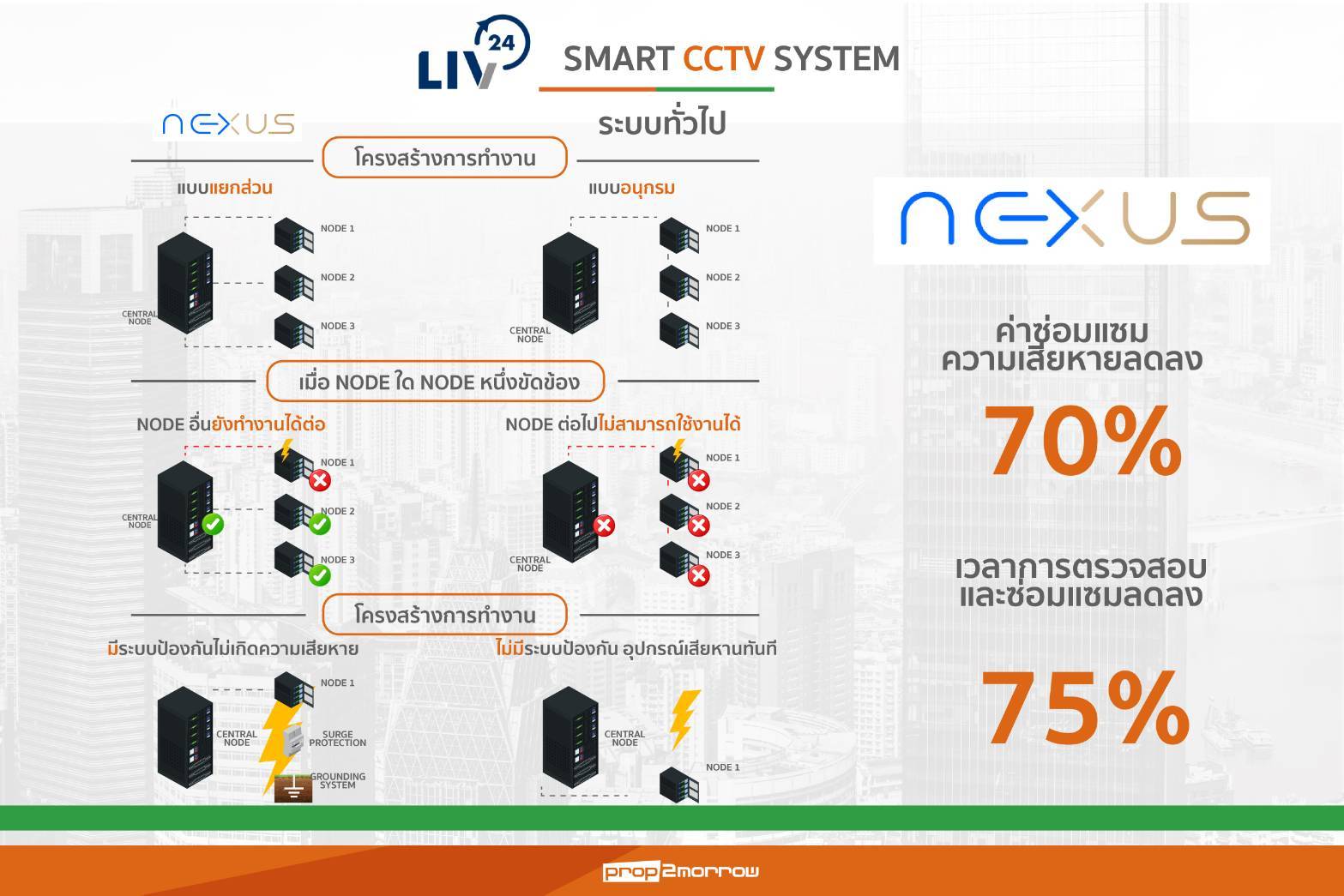 LIV-24 เปิดตัว “NEXUS” ระบบ Smart CCTV ที่ใช้โครงสร้างการทำงานแบบแยกส่วน ที่รักษาความปลอดภัยทั้งเครือข่าย ยังช่วยลดต้นทุนความเสียหายจากการซ่อมแซมได้ถึง 70% และลดระยะเวลาในการซ่อมแซมได้สูงสุดถึง 75% เมื่อเทียบกับระบบเดิม ผสานโซลูชัน AI CCTV Analytics แจ้งเหตุผิดปกติสู่ศูนย์ Command Centre พร้อมบุคลากรผู้เชี่ยวชาญที่สามารถตอบสนองสถานการณ์ได้อย่างแม่นยำและทันท่วงที