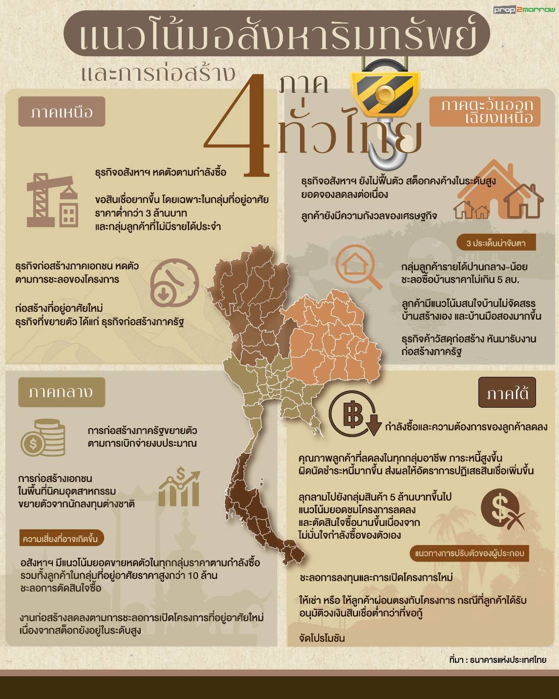 ภาคใต้ ธุรกิจอสังหาริมทรัพย์และก่อสร้างหดตัวเล็กน้อยจากช่วงเดียวกันปีก่อน ตามยอดขายที่อยู่อาศัยที่หดตัวเกือบทุกระดับราคาและทุกพื้นที่ เนื่องจากกำลังซื้อและความต้องการของลูกค้าที่ลดลง คุณภาพลูกค้าที่ลดลงในทุกกลุ่มอาชีพ สะท้อนจากภาระหนี้ที่สูงขึ้น และการผิดนัดชำระหนี้มากขึ้น ขณะที่ สถาบันการเงินระมัดระวังการให้สินเชื่อ ส่งผลให้อัตราการปฏิเสธสินเชื่อ ที่อยู่อาศัยเพิ่มขึ้น นอกจากนี้ ยอดขายที่อยู่อาศัยหดตัวลามไปในกลุ่มบ้านราคา 5 ล้านบาทขึ้นไปชัดเจนขึ้น สะท้อนจากยอดชมโครงการลดลงชัดเจน และตัดสินใจซื้อนานขึ้น เนื่องจากลูกค้าไม่มั่นใจในกำลังซื้อของตัวเองในอนาคต