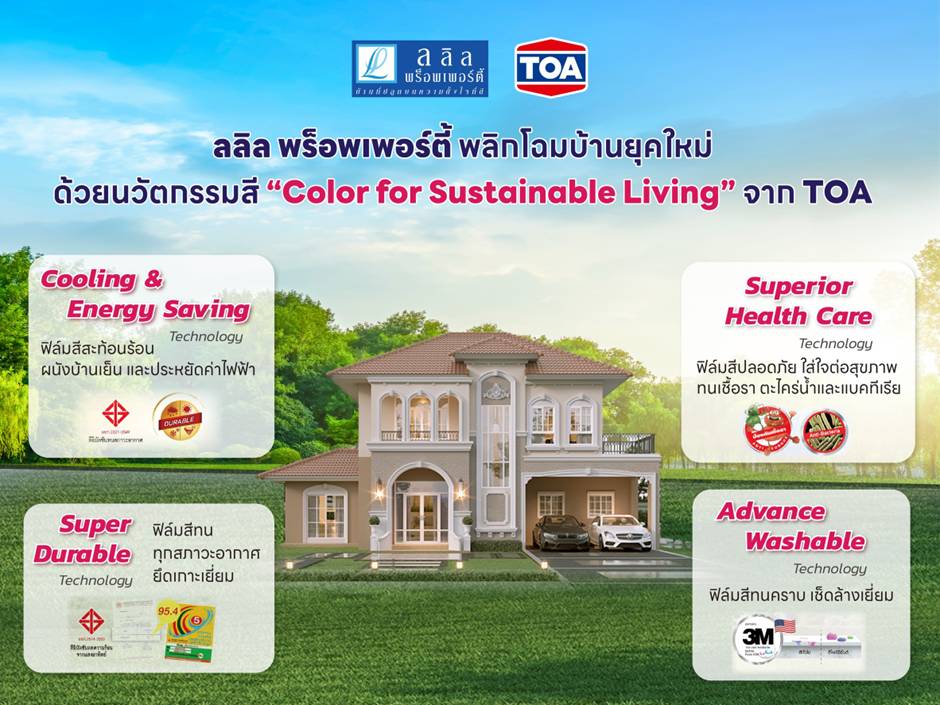 ลลิล พร็อพเพอร์ตี้เดินหน้าพัฒนาที่อยู่อาศัยเติมเต็มไลฟ์สไตล์จากปัจจุบันสู่อนาคต ร่วมมือกับ ‘TOA’ เปิดตัวสี “Color for Sustainable Living” นวัตกรรมสีทาอาคารที่ออกแบบมาเพื่อรองรับที่อยู่อาศัยยุคใหม่ ที่ไม่ใช่แค่การตกแต่งเพื่อความสวยงาม แต่สะท้อนถึงความตั้งใจในการยกระดับคุณภาพชีวิตของผู้อยู่อาศัยให้สอดคล้องกับแนวคิดการพัฒนาการันตีด้วยฉลากลดโลกร้อน ทั้งในมิติของพลังงาน สุขภาพ สิ่งแวดล้อม และความสะดวกสบายในการดูแลรักษาบ้าน