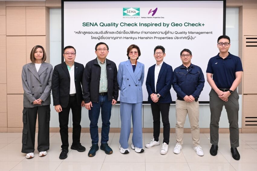 บริษัทเสนาดีเวลลอปเม้นท์ จำกัด (มหาชน) เดินหน้าพัฒนามาตรฐานโครงการด้วยองค์ความรู้ระดับโลก จัดอบรม “SENA Quality Check Inspired by Geo Check+” เพื่อยกระดับมาตรฐานการพัฒนาโครงการอย่างเป็นระบบ โดยนำองค์ความรู้จากพันธมิตรญี่ปุ่น “ฮันคิว ฮันชิน พร็อพเพอร์ตี้ส์ (HHP)” มาประยุกต์ใช้ผ่านการเรียนรู้เชิงลึกที่สำนักงานใหญ่และการลงพื้นที่โครงการ นำโดย ผศ.ดร.เกษรา ธัญลักษณ์ภาคย์ ร่วมกับทาเคชิ สึจิ,เคจิ ฮารากาว่า และทีมงานจากฮันคิว ฮันชิน พร็อพเพอร์ตี้ส์ ประเทศไทย พร้อมได้รับเกียรติจาก ทีมฝ่ายบริหารคุณภาพ (Quality Management) ของ HHP ที่ได้มาถ่ายทอดองค์ความรู้ แนวคิด “Geo Check+” กระบวนการควบคุมคุณภาพ 5 ขั้นตอน ครอบคลุมตั้งแต่การออกแบบ วางแผนก่อสร้าง ควบคุมงาน ไปจนถึงการตรวจสอบก่อนส่งมอบ พร้อมเสริมแนวทางด้านความปลอดภัยและการรับมือภัยพิบัติ เพื่อยกระดับมาตรฐานที่อยู่อาศัยไทยให้มั่นใจได้ทั้งคุณภาพและความปลอดภัยในทุกโครงการ