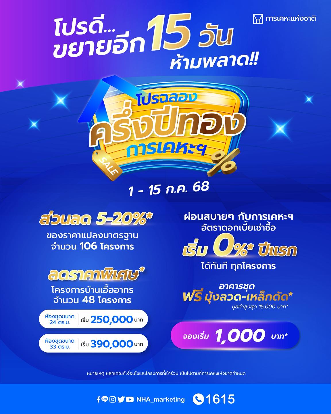 การเคหะแห่งชาติ (กคช.) เดินหน้าสานต่อภารกิจเปิดโอกาสให้ประชาชนเข้าถึงที่อยู่อาศัยคุณภาพในราคาจับต้องได้ ล่าสุดประกาศขยายระยะเวลาแคมเปญใหญ่แห่งปี “ฉลองครึ่งปีทอง กับการเคหะแห่งชาติ” พร้อมนำเสนอที่อยู่อาศัยหลากหลายรูปแบบ ครอบคลุมทุกประเภทโครงการทั่วประเทศทั้งบ้านเอื้ออาทร, เคหะชุมชน, โครงการพัฒนาที่อยู่อาศัยเชิงสังคมและเชิงพาณิชย์ ราคาเริ่มต้น 250,000 – 390,000 บาท ด้วยสิทธิพิเศษ อัตราดอกเบี้ย 0%, ส่วนลดสูงสุด 20%, ฟรีค่ามุ้งลวดเหล็กดัด รวมถึงมาตรการ ผ่อนปรนด้านเครดิต เพื่อช่วยให้คนไทยสามารถมี “บ้านหลังแรก” หรือ “บ้านหลังใหม่” เป็นของตัวเองได้ง่ายขึ้นระยะเวลาแคมเปญออกจนถึงวันที่ 15 กรกฎาคม 2568