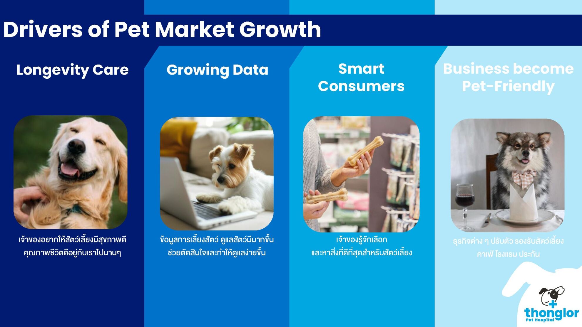 4 ปัจจัยที่ส่งเสริมให้ตลาดสัตว์เลี้ยงเติบโตขึ้นเป็นเพราะสังคมสัตว์เลี้ยงให้คุณค่ากับ longevity และคุณภาพชีวิตของสัตว์เลี้ยงไม่ต่างจากคน เจ้าของสัตว์เลี้ยงให้ความสำคัญกับสุขภาพและคุณภาพชีวิตของสัตว์เลี้ยงมากขึ้น ยอมจ่ายเพื่อผลิตภัณฑ์และบริการที่มีคุณภาพ