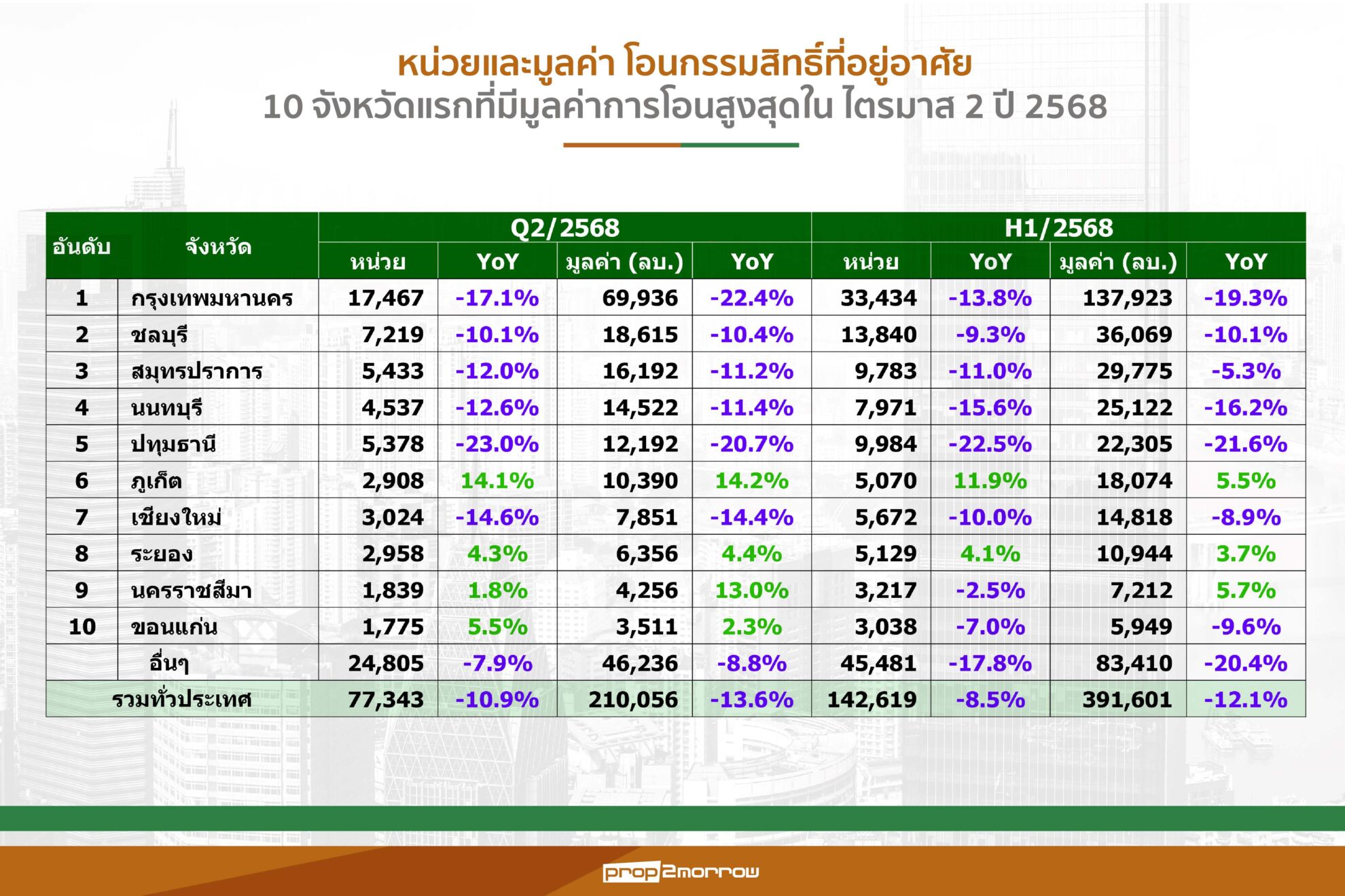 สำหรับจังหวัดที่มีการโอนกรรมสิทธิ์ที่อยู่อาศัยมากที่สุดในช่วงไตรมาส 2ที่ผ่านมา คือ กรุงเทพฯ จำนวน 33,434 ยูนิต มูลค่า 137,923 ล้านบาท รองลงมาเป็นจังหวัดชลบุรีจำนวน 13,840ยูนิต มูลค่า 36,069 ล้านบาท และจังหวัดสมุทรปราการ จำนวน 9,783 ยูนิต มูลค่า 29,775 ล้านบาท
