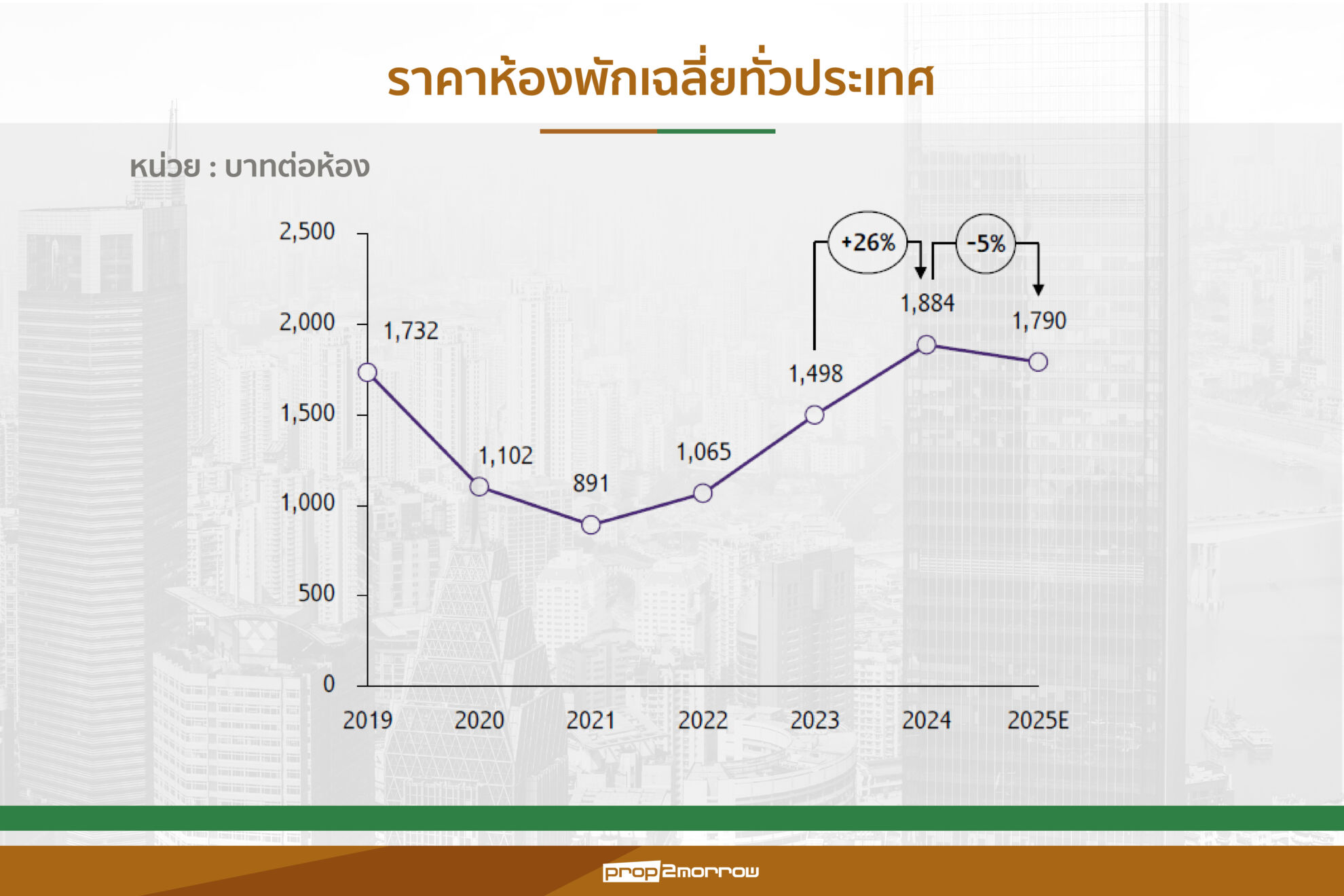 มีแนวโน้มใกล้เคียงกับปี 2024 ที่ 72% ขณะที่ราคาห้องพักเฉลี่ยมีแนวโน้มลดลง -5%YoY มาอยู่ที่ราว 1,790 บาทต่อห้อง โดยในช่วง 6 เดือนแรกของปี ด้วยภาวะที่จำนวนนักท่องเที่ยวต่างชาติลดลงส่งผลให้ธุรกิจโรงแรมต้องหันมาพึ่งพิงรายได้จากนักท่องเที่ยวไทยที่ยังเติบโตมากขึ้นผ่านการใช้กลยุทธ์ด้านราคาสะท้อนได้จากราคาห้องพักเฉลี่ยทั่วประเทศที่ลดลง -5%YoY จาก 1,920 บาทต่อห้องเป็น 1,826 บาทต่อห้อง ซึ่งการใช้กลยุทธ์ด้านราคานอกจากจะดึงดูดนักท่องเที่ยวไทยมากขึ้นแล้ว ยังส่งผลให้ธุรกิจโรงแรมในภาพรวมทั่วประเทศสามารถรักษาอัตราการเข้าพักเฉลี่ยให้อยู่ในระดับใกล้เคียงกับปี 2024 ที่ 72% ได้ โดยในช่วงที่เหลือของปี โครงการเที่ยวไทยคนละครึ่งที่เริ่มใช้สิทธิแล้วในช่วงต้นเดือนกรกฎาคมที่ผ่านมาจะเข้ามาช่วยกระตุ้นให้นักท่องเที่ยวไทยเดินทางท่องเที่ยวมากขึ้นทดแทนนักท่องเที่ยวต่างชาติที่ทยอยฟื้นตัว ส่งผลให้อัตราการเข้าพักเฉลี่ยและราคาห้องพักเฉลี่ยไม่หดตัวมากโดยเฉพาะในช่วงนอกฤดูกาลท่องเที่ยว (กรกฎาคม-กันยายน) และจะฟื้นตัวดีขึ้นในช่วงไตรมาสสุดท้ายของปีซึ่งเป็นช่วงไฮซีซันของการท่องเที่ยวไทยจากการเข้ามามากขึ้นของนักท่องเที่ยวต่างชาติ