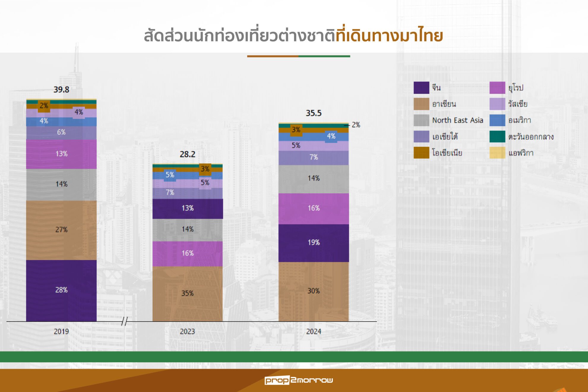 ธุรกิจโรงแรมในปี 2025 ในช่วง 7 เดือนแรกของปี ธุรกิจโรงแรมต้องเผชิญกับแรงกดดันทั้งจากประเด็นด้านความปลอดภัย ความผันผวนทางเศรษฐกิจ และปัญหาภูมิรัฐศาสตร์ที่ส่งผลให้นักท่องเที่ยวต่างชาติลดลง -6.35% YoY มาอยู่ที่ 19.3 ล้านคน โดยนักท่องเที่ยวจีนลดลงสูงสุดกว่า -35% YoY มาอยู่ที่ 2.69 ล้านคนแต่ยังเป็นนักท่องเที่ยวต่างชาติที่เดินทางเข้าไทยสูงสุดตามด้วยนักท่องเที่ยวมาเลเซีย, อินเดีย, รัสเซีย และเกาหลีใต้ ส่งผลให้ภาครัฐเร่งออกมาตรการเรียกความเชื่อมั่นของนักท่องเที่ยวจีนให้กลับคืนมาควบคู่ไปกับการเจาะตลาดศักยภาพที่เติบโตสูงอย่างยุโรปและตะวันออกกลางที่เดินทางมาท่องเที่ยวในไทยมากขึ้น ซึ่งจะส่งผลให้จำนวนนักท่องเที่ยวต่างชาติเริ่มทยอยฟื้นตัว