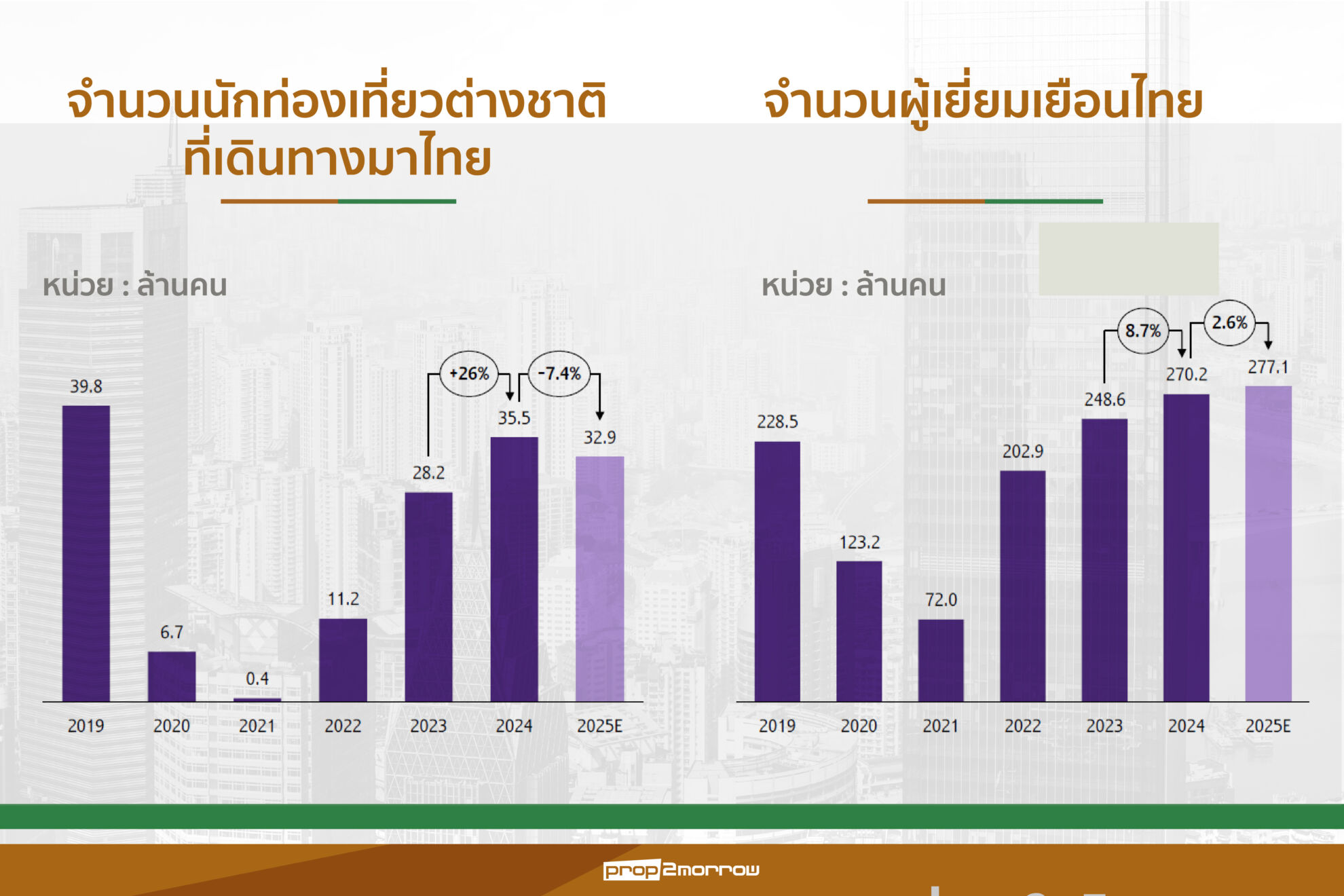 แนวโน้มการท่องเที่ยวจากนักท่องเที่ยวต่างชาติและนักท่องเที่ยวในไทยปี 2025 นักท่องเที่ยวต่างชาติมีแนวโน้มลดลงจากปี 2024 ราว -7%YoY มาอยู่ที่ 32.9 ล้านคน ซึ่งเป็นผลจากการลดลงของนักท่องเที่ยวจีนเป็นหลัก ในช่วง 7 เดือนแรกของปี ธุรกิจโรงแรมของไทยต้องเผชิญกับปัจจัยกดดันที่ส่งผลต่อจำนวนนักท่องเที่ยวต่างชาติอย่างต่อเนื่องทั้งจาก 1. ประเด็นด้านความปลอดภัย จากกระแสข่าวเชิงลบกรณีหวังซิงที่ส่งผลให้นักท่องเที่ยวจีนลดลงทันทีหลังเทศกาลวันหยุดช่วงตรุษจีน และเหตุแผ่นดินไหวรุนแรงในเมียนมาในช่วงปลายเดือนมีนาคมที่สั่นสะเทือนมาถึงพื้นที่กรุงเทพฯ ส่งผลให้นักท่องเที่ยวบางส่วนเกิดความกังวลในความปลอดภัยของโรงแรมที่เป็นตึกสูง 2. ภาวะเศรษฐกิจที่ยังมีความไม่แน่นอนสูง จากการประกาศมาตรการภาษีนำเข้าของสหรัฐฯ ที่จะส่งผลต่อเศรษฐกิจในหลายประเทศจึงทำให้นักท่องเที่ยวทั่วโลกเริ่มชะลอการใช้จ่ายด้านการท่องเที่ยวลง 3. ปัญหาด้านภูมิรัฐศาสตร์ ทั้งความขัดแย้งในตะวันออกกลางที่ปะทุขึ้นจนทำให้ประเทศใกล้เคียงที่มีความเสี่ยงประกาศปิดน่านฟ้าชั่วคราวและสายการบินหลายสายต้องเปลี่ยนเส้นทางบินหรือหยุดให้บริการในบางเส้นทาง และปัญหาชายแดนไทย-กัมพูชาที่ส่งผลให้รัฐบาลประกาศปิดด่านข้ามแดนชั่วคราวซึ่งทำให้เกิดข้อจำกัดในการเดินทางระหว่าง 2 ประเทศ ด้วยปัจจัยกดดันเหล่านี้จึงส่งผลให้จำนวนนักท่องเที่ยวต่างชาติที่เดินทางเข้าไทยตั้งแต่มกราคม-กรกฎาคม 2025 ลดลงราว -6.35%YoY มาอยู่ที่ 19.3 ล้านคน โดยนักท่องเที่ยวจีนเป็นนักท่องเที่ยวที่ลดลงสูงสุดกว่า -35%YoY มาอยู่ที่ 2.69 ล้านคนแต่ยังเป็นนักท่องเที่ยวที่เดินทางเข้าไทยสูงสุดตามด้วยนักท่องเที่ยวมาเลเซีย (2.66 ล้านคน), อินเดีย (1.37 ล้านคน), รัสเซีย (1.12 ล้านคน) และเกาหลีใต้ (0.90 ล้านคน)