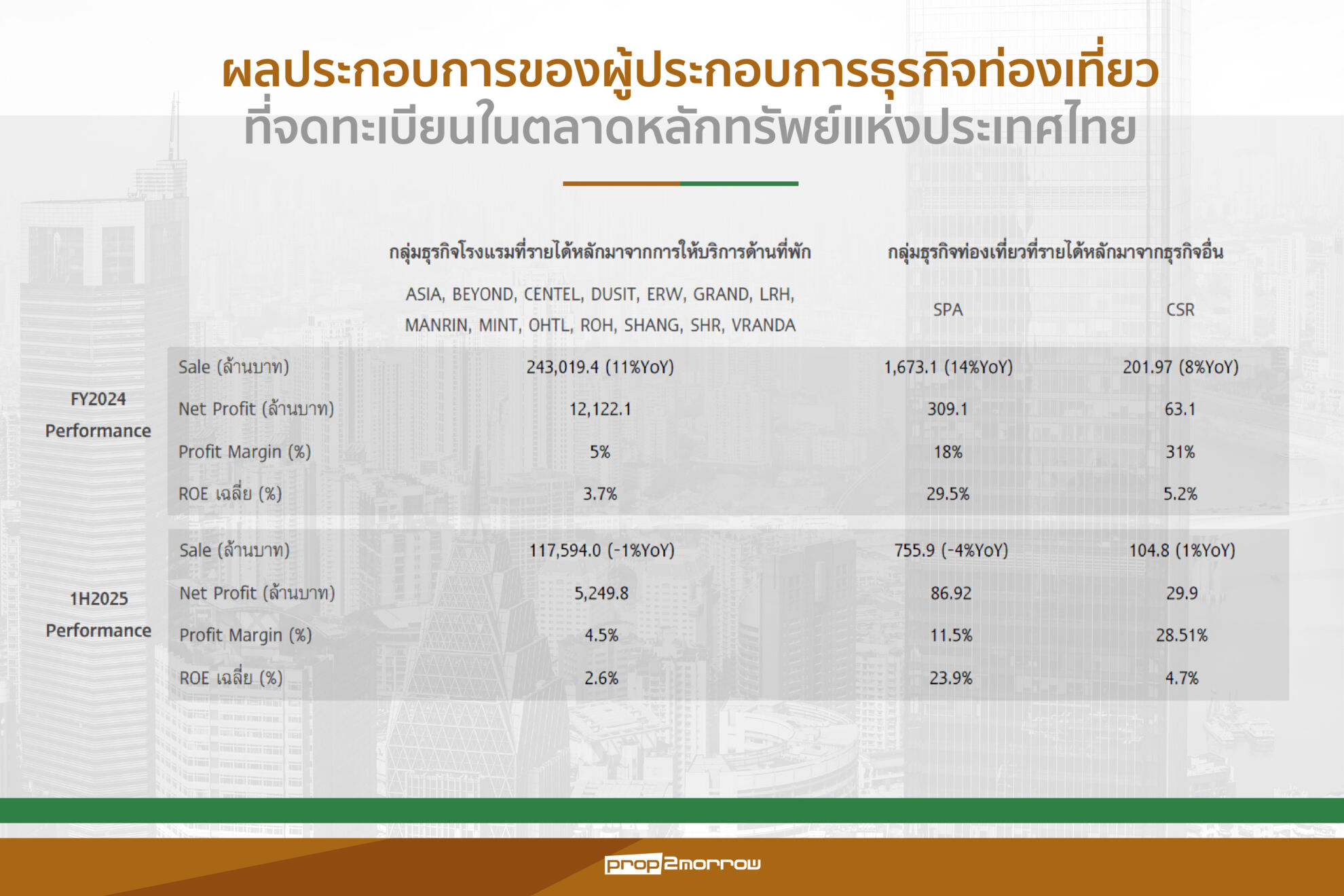 ผู้ประกอบการธุรกิจโรงแรมที่จดทะเบียนในตลาดหลักทรัพย์ ได้แก่ กลุ่มธุรกิจโรงแรมที่รายได้หลักมาจากการให้บริการด้านที่พัก ได้แก่ ASIA, BEYOND, CENTEL, DUSIT, ERW, GRAND, LRH, MANRIN, MINT, OHTL, ROH, SHANG, SHR, VRANDA และกลุ่มธุรกิจท่องเที่ยวที่รายได้หลักมาจากธุรกิจอื่นนอกจากห้องพักโรงแรม ได้แก่ SPA ซึ่งรายได้หลักมาจากธุรกิจสปาเพื่อสุขภาพและเวลเนส รวมถึง CSR ที่รายได้หลักมาจากธุรกิจสนามกอล์ฟ
