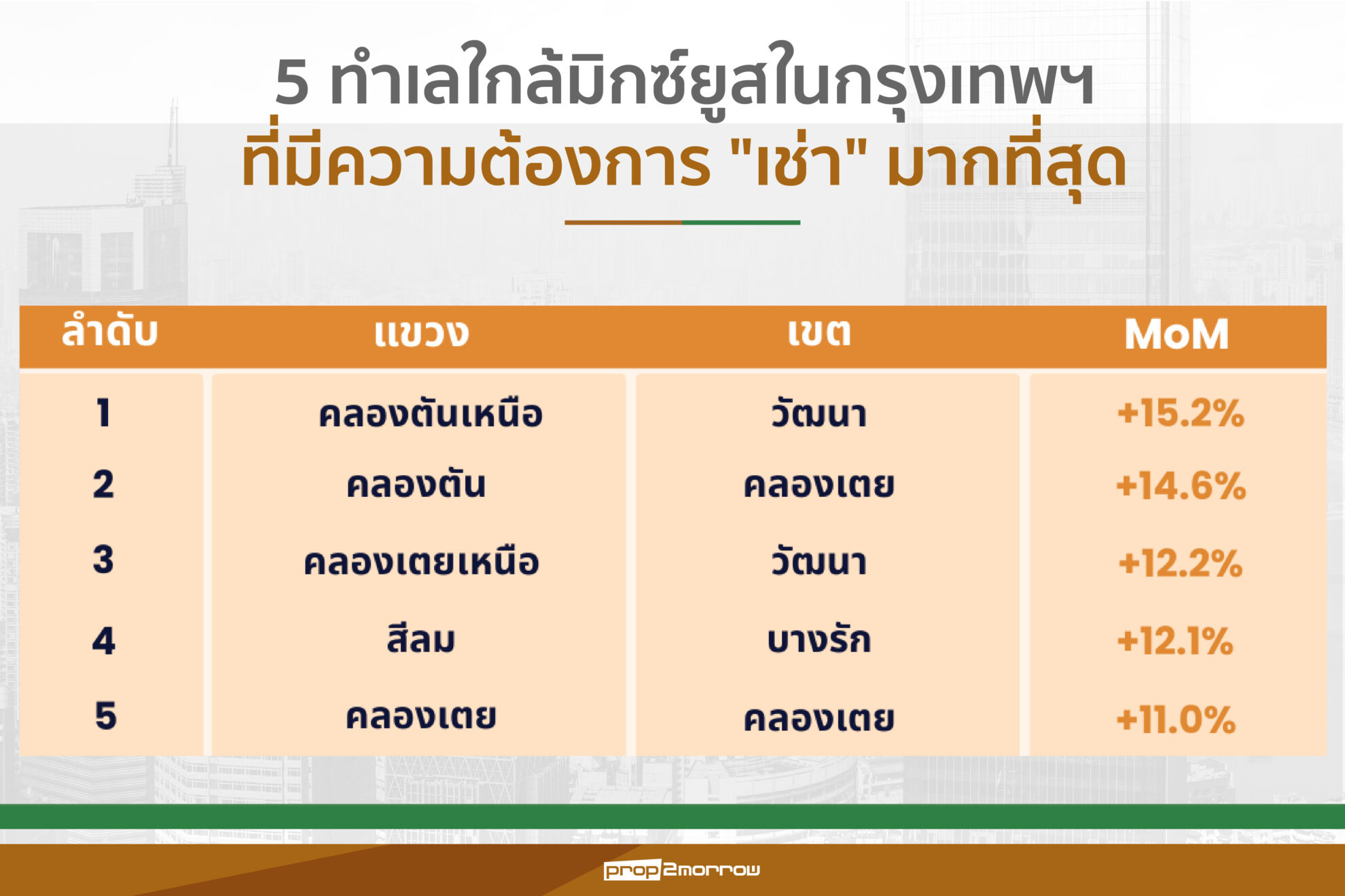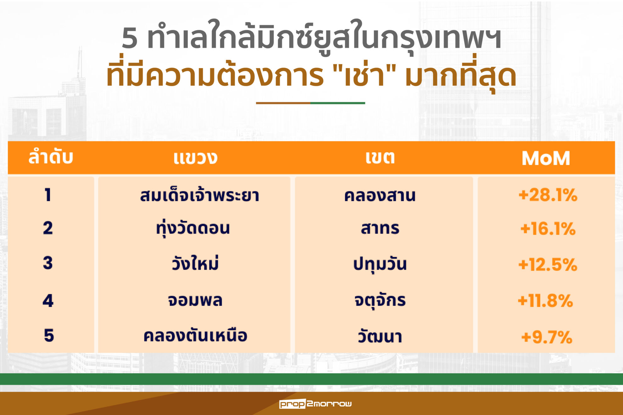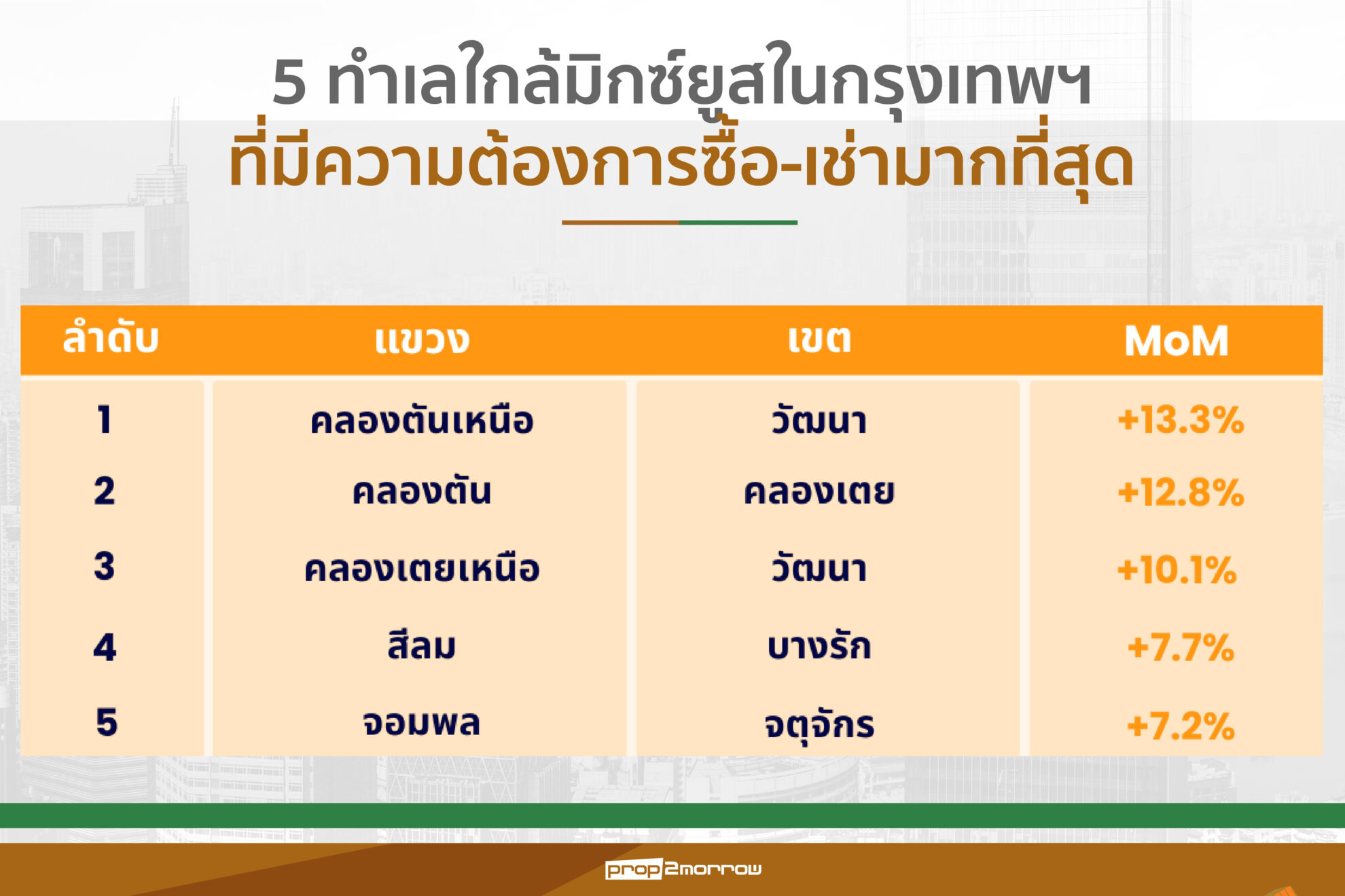 – แขวงคลองตัน เขตคลองเตย เพิ่มขึ้น 8% MoM ตัวอย่างโครงการในเขตนี้ เช่น THE PARQ และ FYI Center เป็นต้น