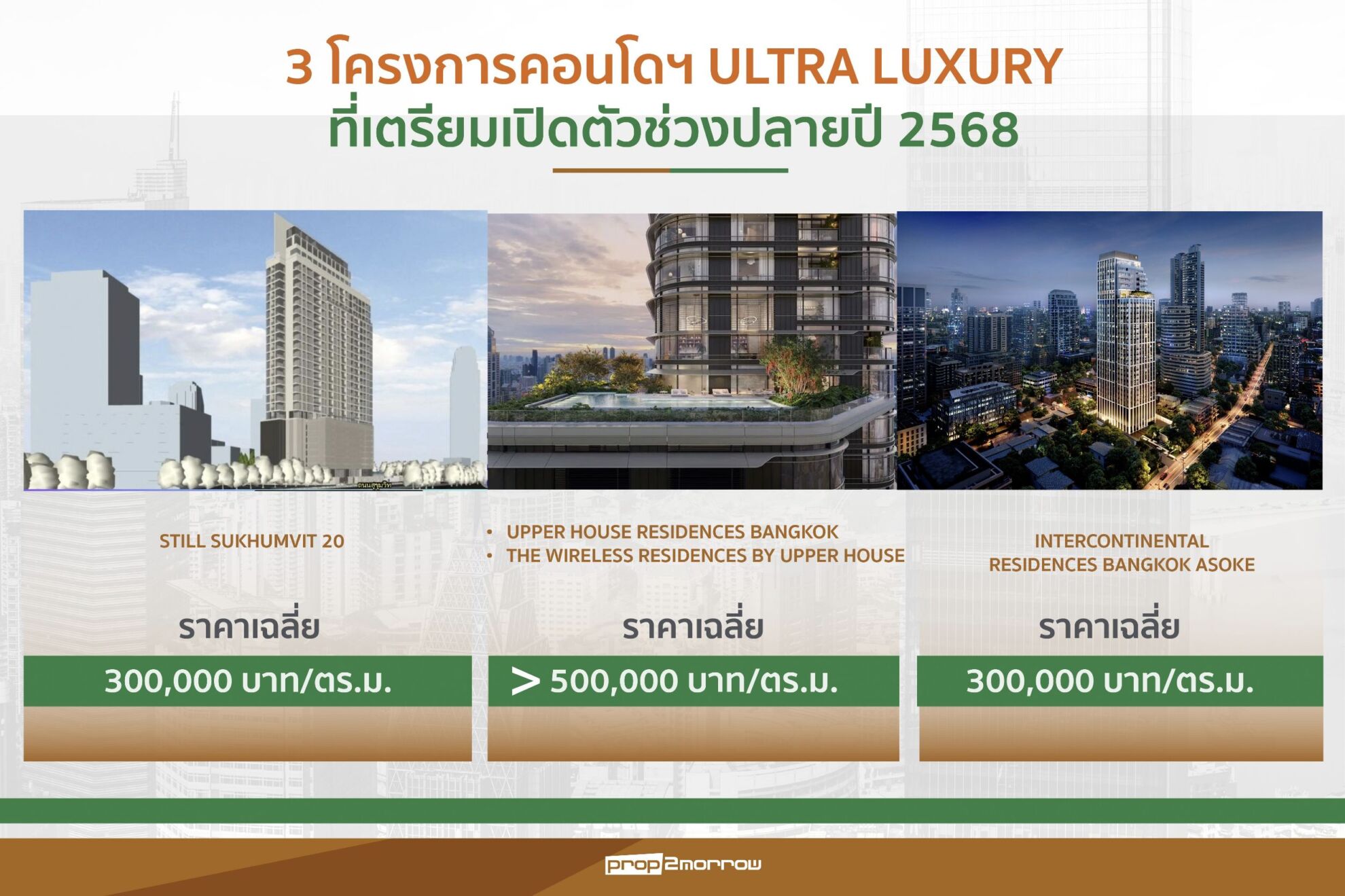 โดยเฉพาะในช่วงปลายปีนี้จะมี 3 โครงการ Ultra Luxury เปิดขายใหม่ ประกอบด้วย Still Sukhumvit – โครงการร่วมทุนระหว่าง SC ASSET และ Tokyo Tatemono จำนวน 124 ยูนิต,โครงการ InterContinental Residences Bangkok Asoke – บนที่ดิน Freehold Branded Residences ของ CG Capital ติดซอยสุขุมวิท 16 ตรงข้ามตลาดปลาวาฬ มีจำนวนเพียง 88 ยูนิต และ โครงการของ Swire Properties (City Dynamic) เป็นอาคารไฮไรส์ 2 อาคารจำนวน 395 ยูนิต ประกอบด้วย อัปเปอร์ เฮาส์ เรสซิเดนเซส แบงค็อก (Upper House Residences Bangkok) สูง 52 ชั้นพร้อมชั้นใต้ดิน 6ชั้น จำนวน156 ยูนิต และเดอะ ไวร์เลส เรสซิเดนเซส บาย อัปเปอร์ เฮาส์ (The Wireless Residences by Upper House) สูง71ชั้น และชั้นใต้ดิน 5ชั้น จำนวน 239 ยูนิต