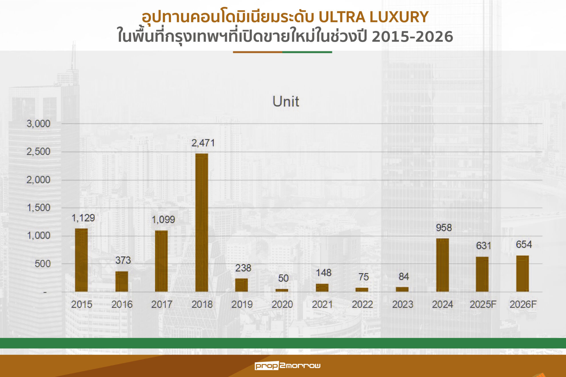 ทั้งนี้จากข้อมูลย้อนหลัง 20 ปีที่ผ่านมาชี้ให้เห็นว่าคอนโดฯที่มีราคาเกิน 500,000 บาทต่อตารางเมตร มีจำนวนไม่ถึง 1,000 ยูนิต ซึ่งคิดเป็นสัดส่วนไม่ถึง 3% ของซัพพลายรวมในรอบ 20 ปีที่มีประมาณ 600,000 กว่ายูนิต ส่วนในช่วง 10 ปีที่ผ่านมา ในพื้นที่กรุงเทพฯ มีคอนโดฯระดับ Ultra Luxury ที่มีราคาขายเฉลี่ยมากกว่า 300,000 บาทต่อตารางเมตรเปิดขายใหม่รวมทั้งหมด 6,625 ยูนิต มูลค่าการพัฒนารวมมากกว่า 205,090 ล้านบาท