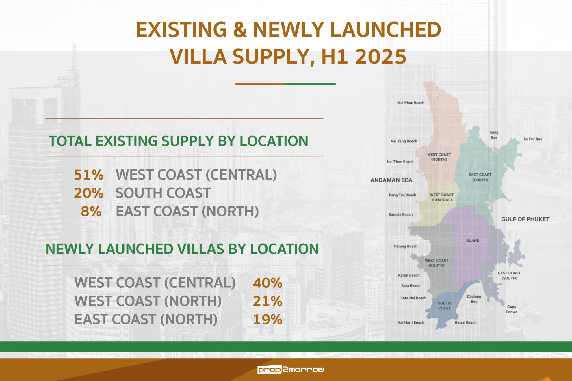 ประกายเพชร มีชูสาร หัวหน้าแผนกซื้อขายอสังหาริมทรัพย์ภูเก็ต บริษัทซีบีอาร์อี ประเทศไทย จำกัด กล่าวว่า ตลาดที่พักอาศัยตากอากาศประเภทวิลล่ามีการเติบโตขึ้นอย่างต่อเนื่องตลอด 3 ปีที่ผ่านมา โดยในปี 2567 ที่ผ่านมามียอดขายเพิ่มขึ้น 23% จากปีก่อนหน้า ขณะที่อุปทานรวมของวิลล่าในเซกเมนต์ลักชัวรีมากกว่า 90 ล้านบาท มีสัดส่วนเพียง 6% ของอุปทานทั้งหมด เพราะมีคู่แข่งน้อย แต่อัตราการขายสะสมสูง สำหรับตลาดวิลล่าหรูโดยรวมในครึ่งปีแรกของปี 2568 มีอัตราการขายสะสมสูงถึง 75% โดยทำเลที่ได้รับความนิยมสูงที่สุด คือ ทำเลชายฝั่งตะวันออก (ทิศใต้) สามารถทำยอดขายได้สูงที่สุดถึง 92.8%
