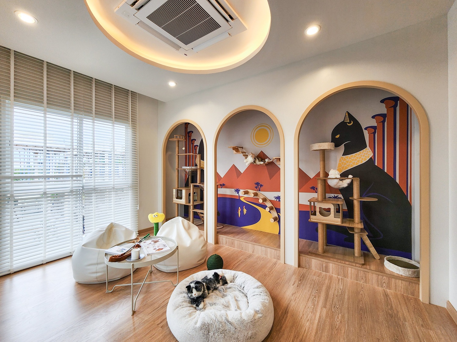 มาที่ชั้น 3 ต้องบอกว่าปัจจุบันมีหลายครอบครัวที่ให้ความสำคัญกับสัตว์เลี้ยง 4 ขากันมากขึ้น เสมือนเป็นสมาชิกในครอบครัว การออกแบบพื้นที่จึงมีการคิดพื้นที่ หรือมุมพิเศษเพื่อรองรับสัตว์เลี้ยงแสนรัก เป็นดีเทลเล็ก ๆ แต่สะท้อนโจทย์ชีวิตคนยุคนี้ได้ดีมาก ดังนั้น ความสำคัญของการออกแบบและตกแต่งบ้านหลังนี้นับว่า เป็นตัวอย่างของงานออกแบบที่ครบทั้ง ฟังก์ชัน ความรู้สึก สเปซที่เชื่อมอย่างฉลาด และสไตล์ที่สะท้อนตัวตนของเจ้าของบ้านได้ชัดเจน