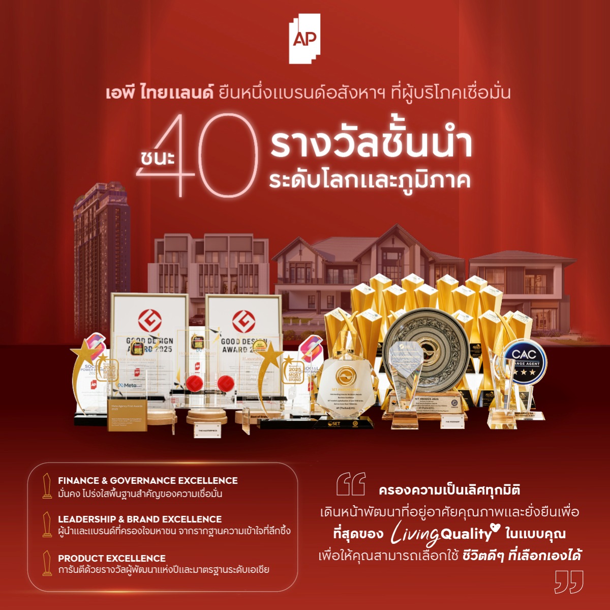 อย่างไรก็ตามบทสรุปความสำเร็จจากการชนะเลิศกับ 40 รางวัลตลอดปี 2568 ถือเป็นเครื่องพิสูจน์ที่ชัดเจนถึงความเป็นผู้นำและความมุ่งมั่นเชิงรุกของ เอพี ไทยแลนด์ ในการขับเคลื่อนอุตสาหกรรมอสังหาริมทรัพย์ไทยให้เติบโตอย่างมีคุณภาพและยั่งยืน เพื่อพร้อมเดินหน้ายกระดับมาตรฐานใหม่และส่งมอบ ‘ชีวิตดีๆ ที่เลือกเองได้’ ให้กับลูกค้าและสังคมไทยอย่างต่อเนื่องในทุกก้าวย่างของอนาคต