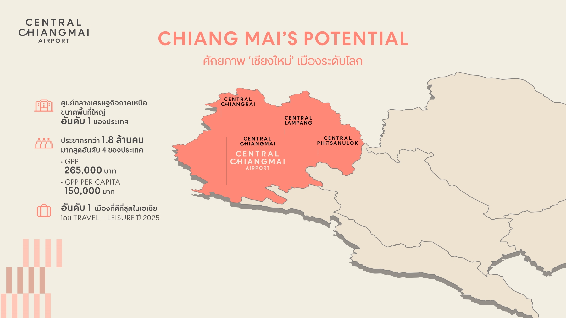 เซ็นทรัล เชียงใหม่ แอร์พอร์ต อยู่คู่เชียงใหม่มา 30 ปี ตั้งอยู่พื้นที่ทางทิศใต้ใกล้ตัวเมือง รวมทั้งย่านธุรกิจ โรงพยาบาล โครงการที่พักอาศัยกว่า 150 แห่ง ส่วนใหญ่เป็นหมู่บ้านขนาดใหญ่ที่มีมานาน, สถาบันการศึกษา และเดินทางเพียง 3 นาที จากสนามบินนานาชาติเชียงใหม่ อีกทั้ง ยังใกล้พื้นที่อำเภอหางดง และสารภี ซึ่งเป็นชุมชนงานคราฟต์ มีความเป็น Local Touch เมื่อ Landscape เมืองเปลี่ยน มีการขยายตัวออกไปต่อเนื่อง จากศูนย์กลางสู่พื้นที่รอบนอก ทำให้ Catchment ของเมืองโตขึ้น มีความ Sophisticated ขึ้น ทั้งในด้านรายได้ และไลฟ์สไตล์ การทรานส์ฟอร์มเซ็นทรัล เชียงใหม่ แอร์พอร์ต จึงเป็นการตอบโจทย์ดีมานด์ใหม่ของเมืองและยกระดับสู่การเป็นแลนด์มาร์กมิกซ์ยูสแห่งใหม่ของเมือง ทำให้ดึงดูดนักท่องเที่ยวทั้งชาวไทยและต่างชาติ โดยปี 2568 มีทราฟฟิกกว่า 13 ล้านคนต่อปี เฉลี่ย 38,000 คน/วัน คาดปี 2569 เพิ่มเป็น 42,000 คน/วัน ในขณะที่เซ็นทรัล เชียงใหม่ ทำหน้าที่รองรับการขยายตัวของเมืองฝั่งเหนือ