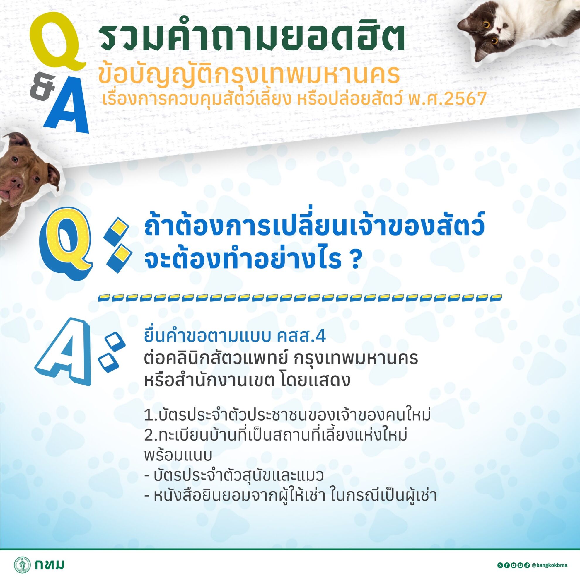 ห้ามเลี้ยงสุนัขและแมวในที่สาธารณะหรือในที่ของบุคคลอื่นโดยปราศจากความยินยอม เจ้าของสุนัขและแมวมีหน้าที่กำจัดสิ่งปฏิกูลอันเกิดจากสัตว์ของตนในที่สาธารณะหรือในที่อื่นในเขตกรุงเทพมหานคร หากเจ้าของสุนัขและแมว ประสงค์จะมอบสัตว์ให้แก่เจ้าของใหม่ เจ้าของสัตว์ต้องยื่นคำขอตามแบบ คลส.4 พร้อมแสดงบัตรประจำตัวประชาชนของเจ้าของคนใหม่ และทะเบียนบ้านที่เป็นสถานที่เลี้ยงแห่งใหม่ พร้อมทั้งเอกสารประกอบ คือ บัตรประจำตัวสุนัข และแมว ตามแบบ คลส.3 หนังสือยินยอมจากผุ้ให้เช่า (กรณีเป็นผู้เช่า) และ หนังสือมอบอำนาจ (ถ้ามี)