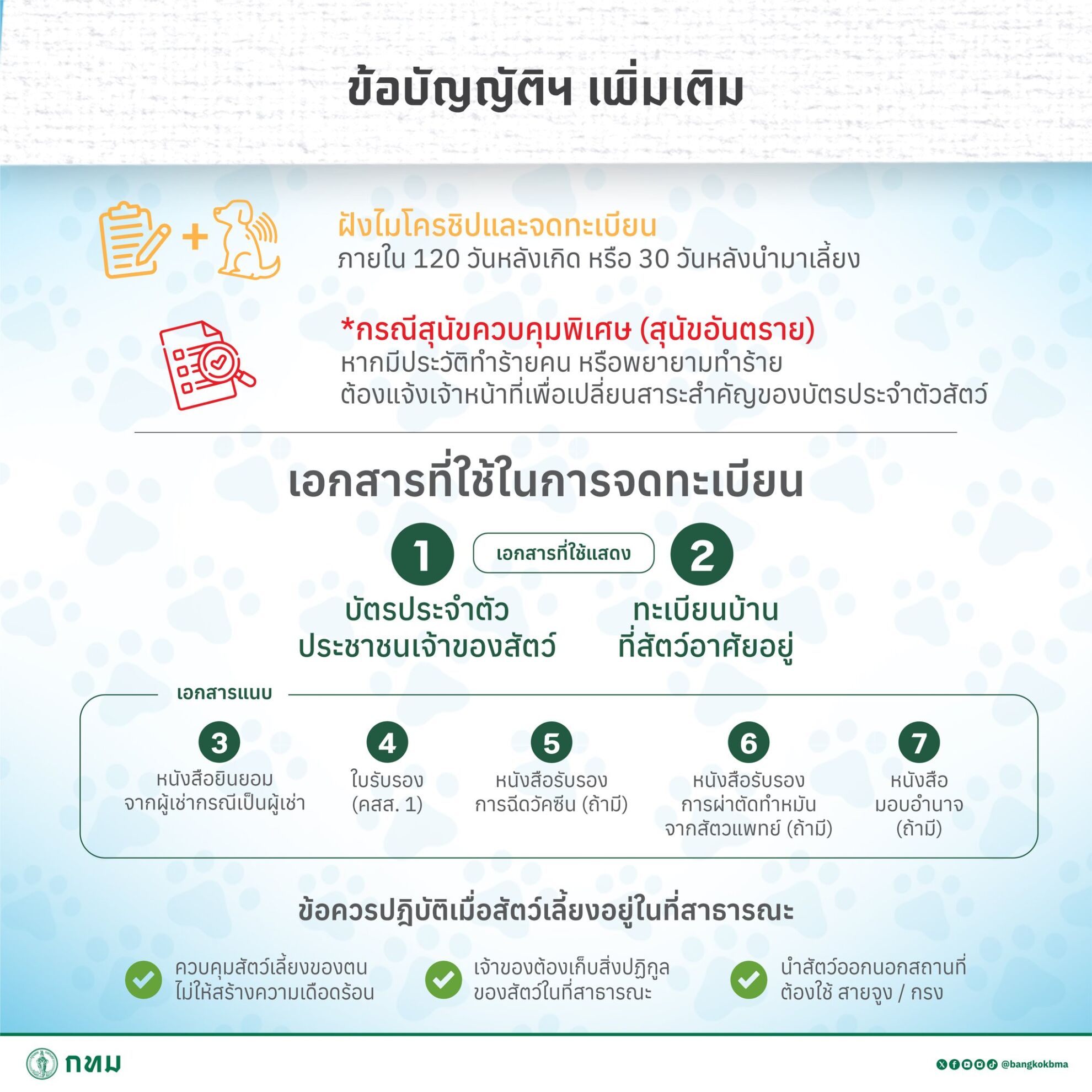เจ้าของสัตว์เลี้ยงมีหน้าที่ต้องลงทะเบียนสัตว์เลี้ยงของตนเองกับหน่วยงานที่ กทม. กำหนด ซึ่งเป็นเรื่องง่ายและสำคัญมาก! การลงทะเบียนจะช่วยให้ กทม. มีข้อมูลในการบริหารจัดการด้านสาธารณสุข และการช่วยเหลือสัตว์เลี้ยงในภาวะฉุกเฉินได้ทันท่วงทีวิธีการลงทะเบียนจะมีการประกาศให้ทราบอย่างเป็นทางการผ่านช่องทางต่าง ๆ ของ กทม. ลงทะเบียนได้แล้ววันนี้ คลิก>>>>>ฐานข้อมูลทะเบียนสัตว์เลี้ยง