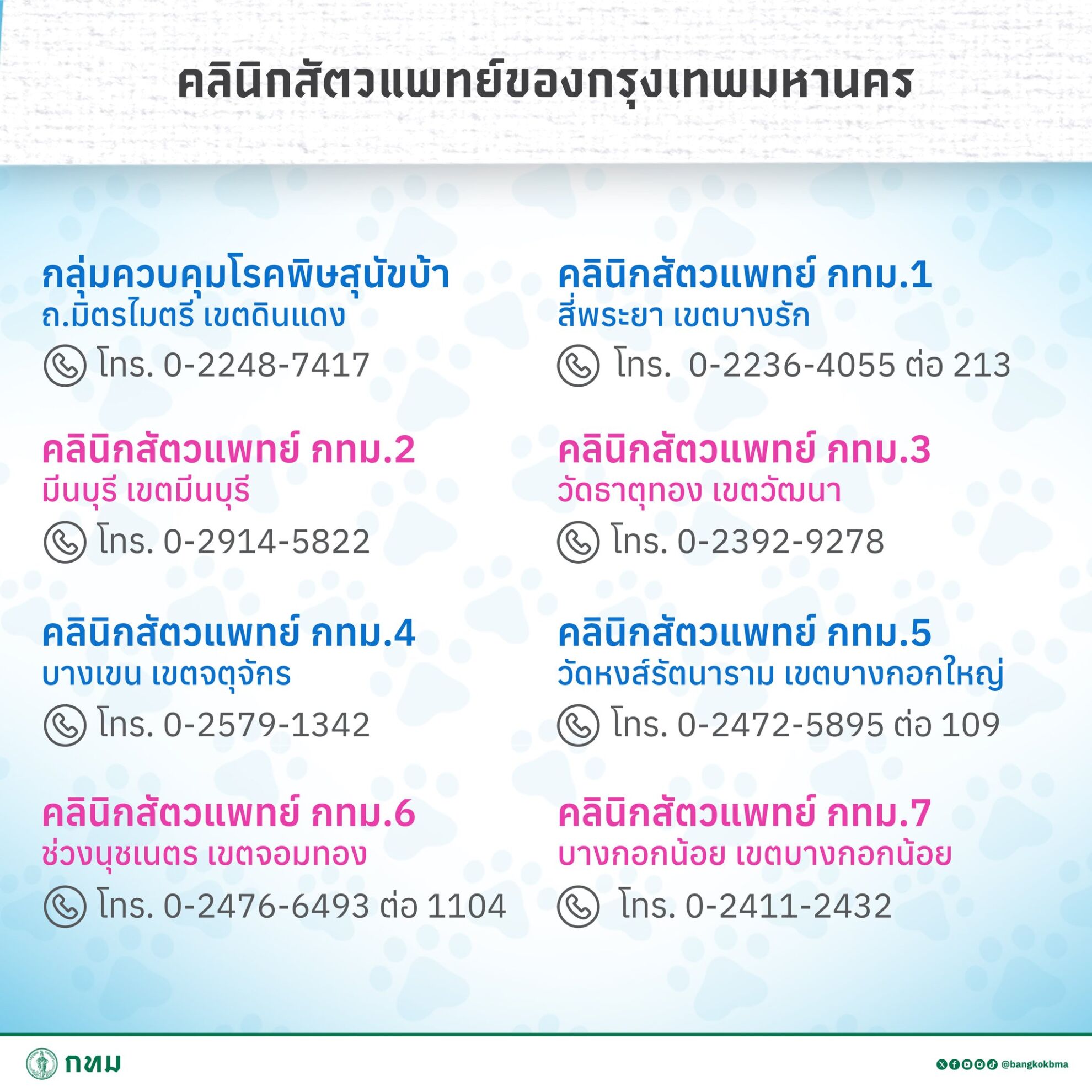 เจ้าของสัตว์เลี้ยงมีหน้าที่ต้องลงทะเบียนสัตว์เลี้ยงของตนเองกับหน่วยงานที่ กทม. กำหนด ซึ่งเป็นเรื่องง่ายและสำคัญมาก! การลงทะเบียนจะช่วยให้ กทม. มีข้อมูลในการบริหารจัดการด้านสาธารณสุข และการช่วยเหลือสัตว์เลี้ยงในภาวะฉุกเฉินได้ทันท่วงทีวิธีการลงทะเบียนจะมีการประกาศให้ทราบอย่างเป็นทางการผ่านช่องทางต่าง ๆ ของ กทม. ลงทะเบียนได้แล้ววันนี้ คลิก>>>>>ฐานข้อมูลทะเบียนสัตว์เลี้ยง
