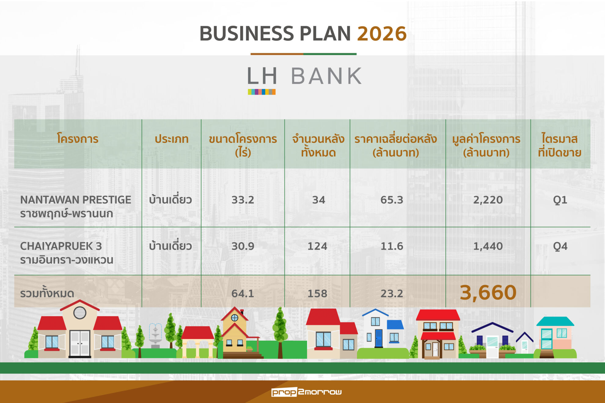 ทั้งนี้เมื่อรวมกับโครงการที่ดำเนินการอยู่ในปัจจุบัน จะทำให้มีจำนวนโครงการที่ดำเนินการในปี 2569 ทั้งหมด 69 โครงการ มูลค่าประมาณ 80,000 ล้านบาท โดยเป็นสินค้าแนวราบ 63 โครงการ มูลค่าประมาณ 69,000 ล้านบาท และคอนโดมิเนียม 6 โครงการ มูลค่ากว่า 11,000 ล้านบาท ในจำนวนนี้เป็นโครงการคอนโดฯสร้างเสร็จพร้อมโอน 5 โครงการ และอีก 1 โครงการอยู่ระหว่างการก่อสร้าง คือ โครงการวันเวลา ณ เจ้าพระยา คาดว่าจะสร้างเสร็จและเริ่มโอนได้ในช่วงกลางไตรมาส 4 นี้