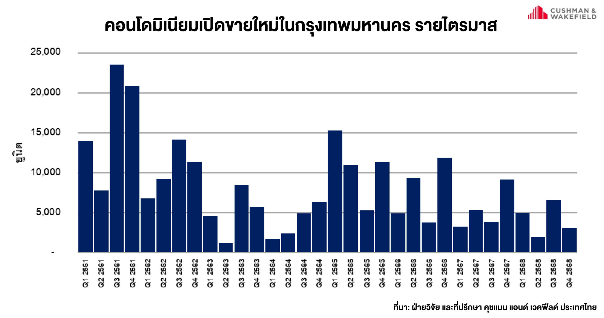 ตลาดคอนโดมิเนียมในปี 2568 เป็นอีกปีที่เห็นการชะลอตัวของโครงการใหม่แบบชัดเจน โดยทั้งปีมีคอนโดมิเนียมเปิดขายใหม่ประมาณ 16,408 ยูนิต และในไตรมาส 4/2568 มีคอนโดมิเนียมเปิดขายใหม่ประมาณ 3,100 ยูนิต ลดลงประมาณ 56% จากไตรมาสก่อนหน้านี้ (Q3/2568) ตามสภาวะเศรษฐกิจของประเทศที่ยังชะลอตัว ซึ่งปีที่ผ่านมารัฐบาลก็ไม่มีนโยบายหรือมาตรการกระตุ้นเศรษฐกิจที่ชัดเจนออกมา มีเพียงเรื่อง การลดค่าธรรมเนียมการโอนกรรมสิทธิ์ และจดจำนองกับสถาบันการเงิน ที่ออกมาก่อนหน้าเท่านั้น ผู้ประกอบการพยายามเรียกร้องกับรัฐบาลมาตลอด แล้วมาเจอ เรื่อง อุทกภัยเกือบทุกภาคของประเทศไทย ทำให้ความสำคัญในเรื่องอื่นๆ กลายเป็นเรื่องรอง และหลังจากนั้นก็ยุบสภา รอการเลือกตั้งใหม่ต้นปี 2569
