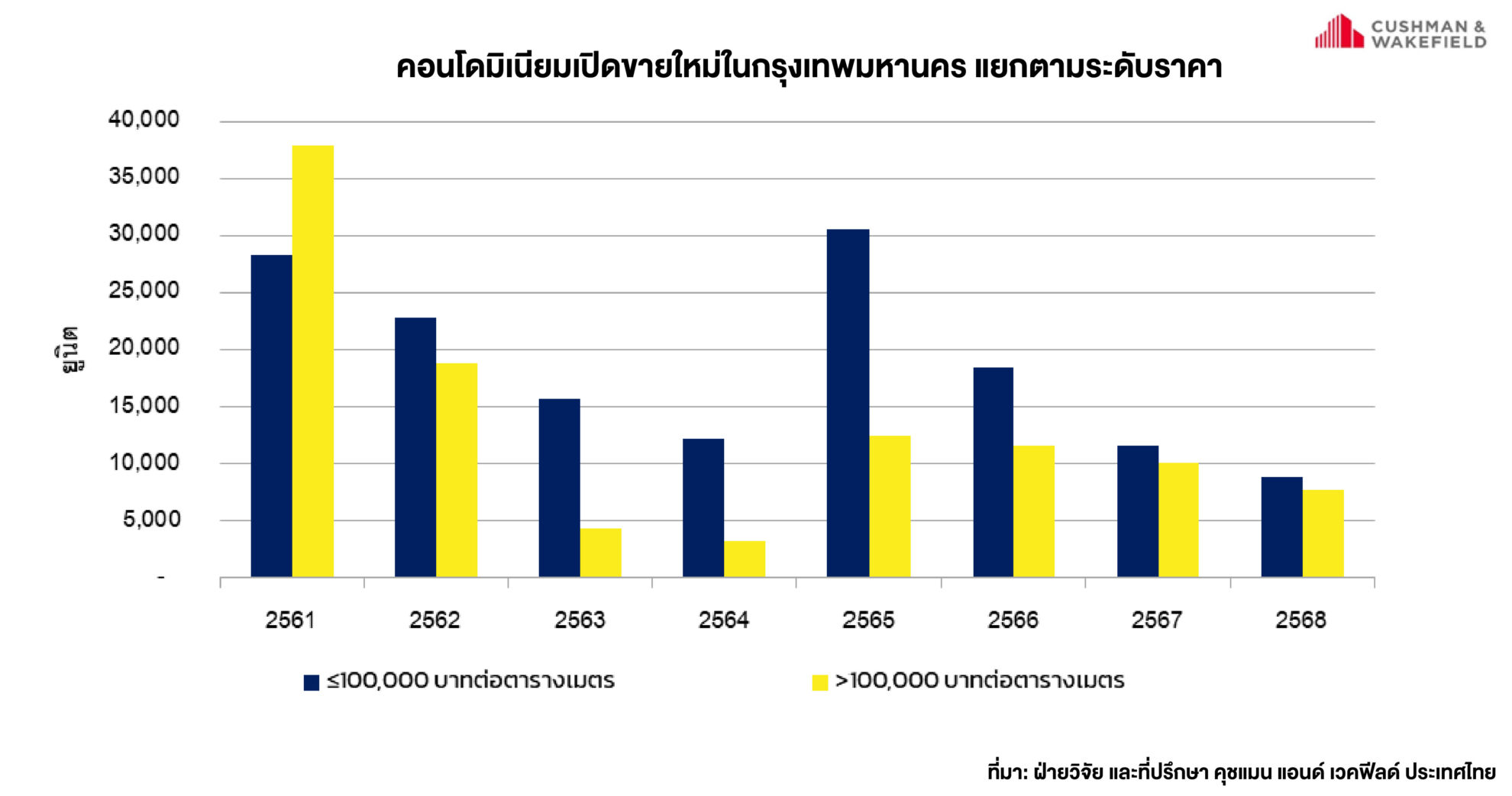 สุรเชษฐ กองชีพ หัวหน้าฝ่ายวิจัยและที่ปรึกษา บริษัท คุชแมน แอนด์ เวคฟิลด์ (ประเทศไทย) จำกัด เปิดเผยว่า คอนโดมิเนียมที่เปิดขายใหม่ในปี 2568 มีราคาขายที่มากกว่า 100,000 บาทต่อตารางเมตรมากขึ้น และมีหลายโครงการที่มีราคาขายมากกว่า 200,000 บาทต่อตารางเมตร นอกจากนี้ ยังมีโครงการราคาแพงที่รอการเปิดขายอีกในปี 2569 ซึ่งเริ่มมีการประชาสัมพันธ์ออกมาบ้างแล้วในช่วงไตรมาสสุดท้ายของปี 2568 ผู้ประกอบการเลือกที่จะเปิดขายโครงการคอนโดมิเนียมลดลงแบบชัดเจน เมื่อเทียบกับปีที่ผ่านมา เพราะกำลังซื้อลดลงมาก อีกทั้งผู้ประกอบการพยายามปิดการขายโครงการที่สร้างเสร็จแล้วมากกว่าการเปิดขายโครงการใหม่ ซึ่งอาจจะมีการลดราคาหรือลดกำไรลงบ้าง เพื่อปิดการขายและโอนกรรมสิทธิ์ให้ได้มากที่สุดภายในปี 2568 จึงมีผลให้รายได้และกำไรของผู้ประกอบการลดลง แต่ก็ยังไม่ขาดทุน หรือ มีรายได้ติดลบ มีแค่ในส่วนของกำไรที่น้อยลงเท่านั้นแต่ก็ยังกำไรอยู่