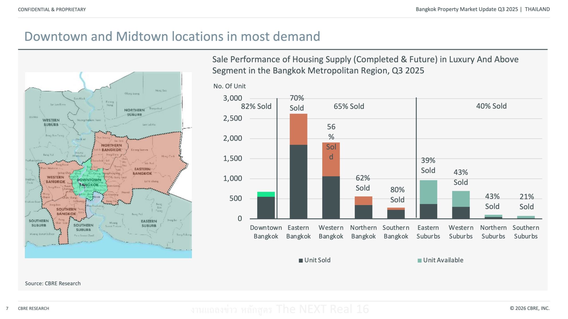 เพ็ญธิดา ศรีสว่าง ผู้อำนวยการ บริษัท ซีบีอาร์อี (ประเทศไทย) จำกัด (CBRE) กล่าวว่า ปี 2569 เป็นปีที่ผู้พัฒนาโครงการและนักลงทุนต้องบริหารสมดุลระหว่างความเสี่ยงและผลตอบแทน ท่ามกลางความไม่แน่นอนทางเศรษฐกิจ โดยโอกาสทางธุรกิจยังคงอยู่ในกลุ่มที่สามารถปรับตัวให้สอดรับกับพฤติกรรมผู้บริโภคที่เปลี่ยนแปลง ทั้งการพัฒนาโครงการใหม่และการยกระดับสินทรัพย์ที่มีอยู่เดิม โดยให้ความสำคัญกับคุณภาพและความยืดหยุ่นของรูปแบบการดำเนินธุรกิจมากขึ้น