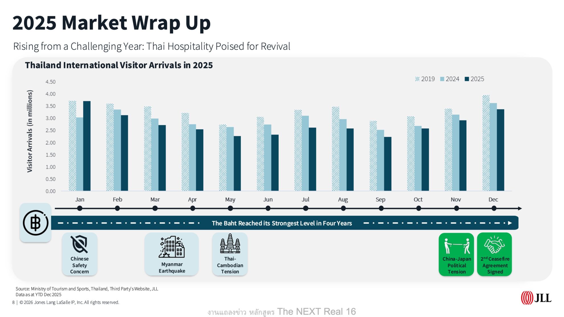 ส่วน การัณย์ คานิเยาว รองประธานอาวุโส ฝ่ายบริการลงทุนซื้อขาย ภาคพื้นเอเชียแปซิฟิก จากกลุ่มบริการการลงทุนด้านโรงแรม บริษัทโจนส์ แลง ลาซาลล์ (ประเทศไทย) จำกัด กล่าวว่า ตลาดอสังหาฯไทยในปี 2569 ยังคงขับเคลื่อนด้วยการเปลี่ยนแปลงโครงสร้างเศรษฐกิจและเทคโนโลยี โดยนักลงทุนให้ความสำคัญกับสินทรัพย์ที่สามารถสร้างผลตอบแทนระยะยาวและรองรับการเติบโตในอนาคตมากขึ้น รวมถึงแนวทางการพัฒนาและบริหารจัดการที่สอดรับกับหลัก ESG ซึ่งจะเป็นปัจจัยสำคัญในการกำหนดทิศทางตลาด