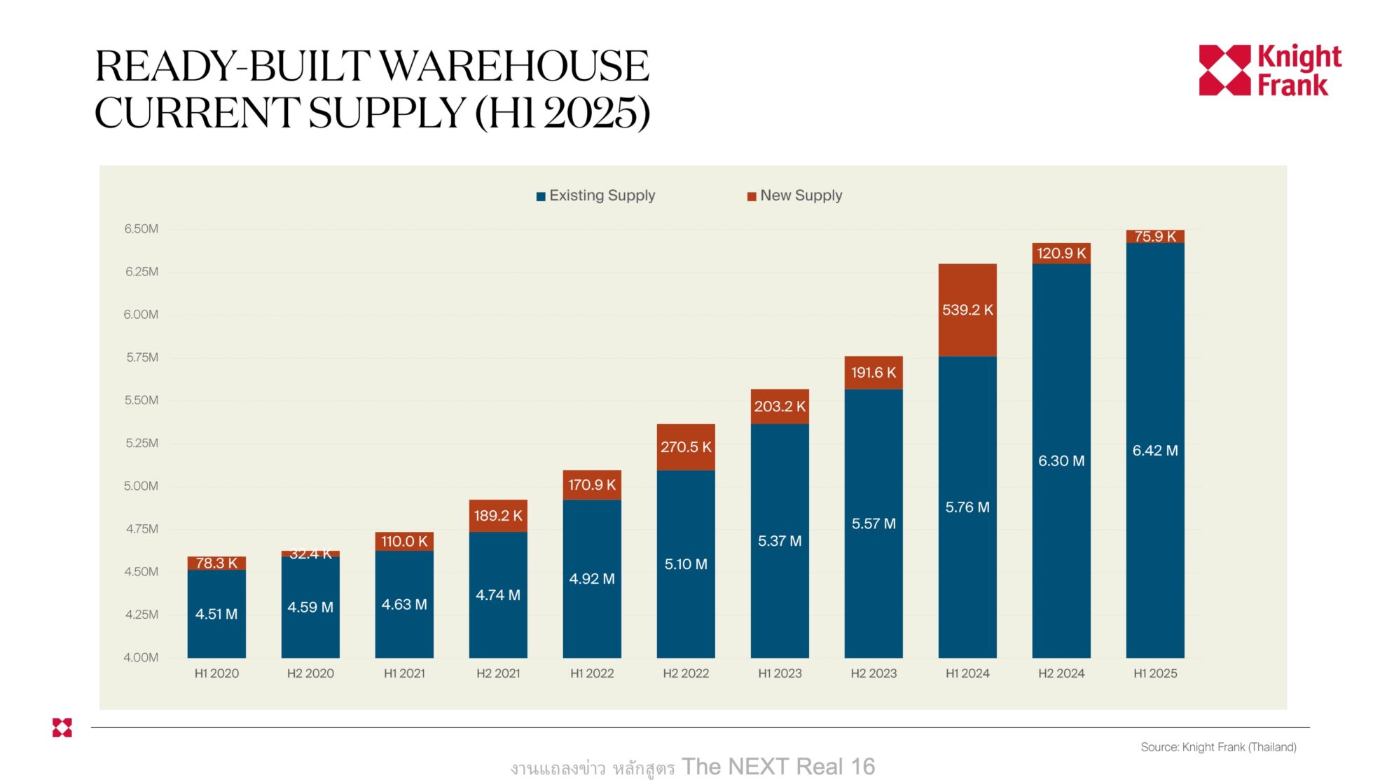 ตลาดอุตสาหกรรมและคลังสินค้า ในกลุ่มนี้ถือว่ามีผลประกอบการที่โดดเด่นมากในช่วง 2 ปีที่ผ่านมา โดยมีการเติบโตที่มั่นคง ซึ่งคลังสินค้า (Warehouse) ปัจจุบันมีซัพพลายรวมประมาณ 6,000,000 ตารางเมตร โดยมีอัตราการเช่าอยู่ที่ 85.5% และราคาเช่าเฉลี่ยอยู่ที่ประมาณ 161 บาทต่อตารางเมตร ตลาดคลังสินค้ามีความยืดหยุ่นสูงเนื่องจากลักษณะการสร้างมักเป็นแบบ Build-to-order หรือสร้างเมื่อมีคำสั่งเช่า ทำให้ซัพพลายและดีมานด์ค่อนข้างสมดุลกัน และโรงงานอุตสาหกรรม (Factory) มีซัพพลายประมาณ 3,900,000 ตารางเมตร โดยมีอัตราการเช่าสูงถึง 98.4% และราคาเช่าเฉลี่ยอยู่ที่ 202 บาทต่อตารางเมตร ส่วนทำเลหลักแบ่งออกเป็น 3 โซนสำคัญ คือ Bangkok Metropolitan บริเวณถนนบางนา-ตราด, Central Ayutthaya, Future Park Rangsit และ EEC ชลบุรี, ระยอง ซึ่งเป็นโซนที่เติบโตเร็วที่สุดจากการสนับสนุนของภาครัฐ ทำให้ราคาที่ดินและโรงงานในโซนนี้ขยับตัวสูงขึ้นเทียบเท่าหรือสูงกว่าบางนา