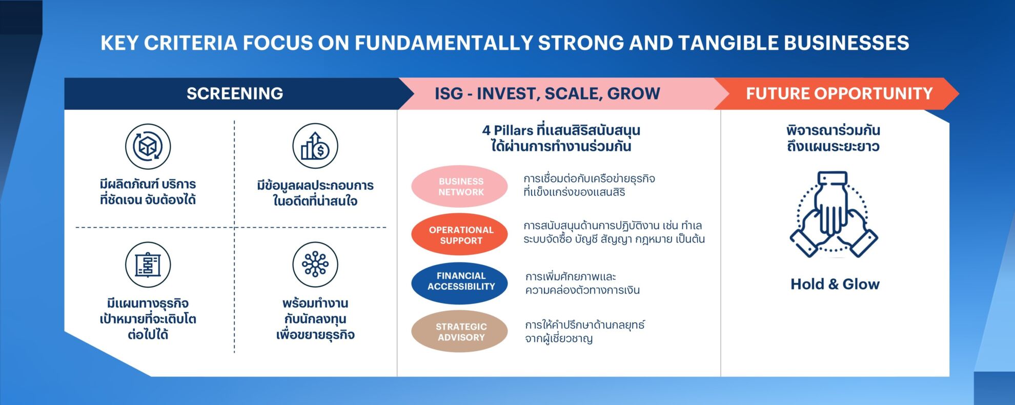 • Grow – เติบโตสู่ความยั่งยืน: พร้อมปักธงแนวทางการสร้างมูลค่าเพิ่มสู่ “การเจริญเติบโตระยะยาว ซึ่งอาจเป็นการร่วมทุนต่อเนื่อง การถอนการลงทุน(Exit Pathway) ที่ชัดเจนภายใน 5-7 ปี ไม่ว่าจะเป็นการขายกิจการ (Private Sell), การควบรวมกิจการ (M&A) หรือการนำบริษัทเข้าจดทะเบียนในตลาดหลักทรัพย์ (IPO)