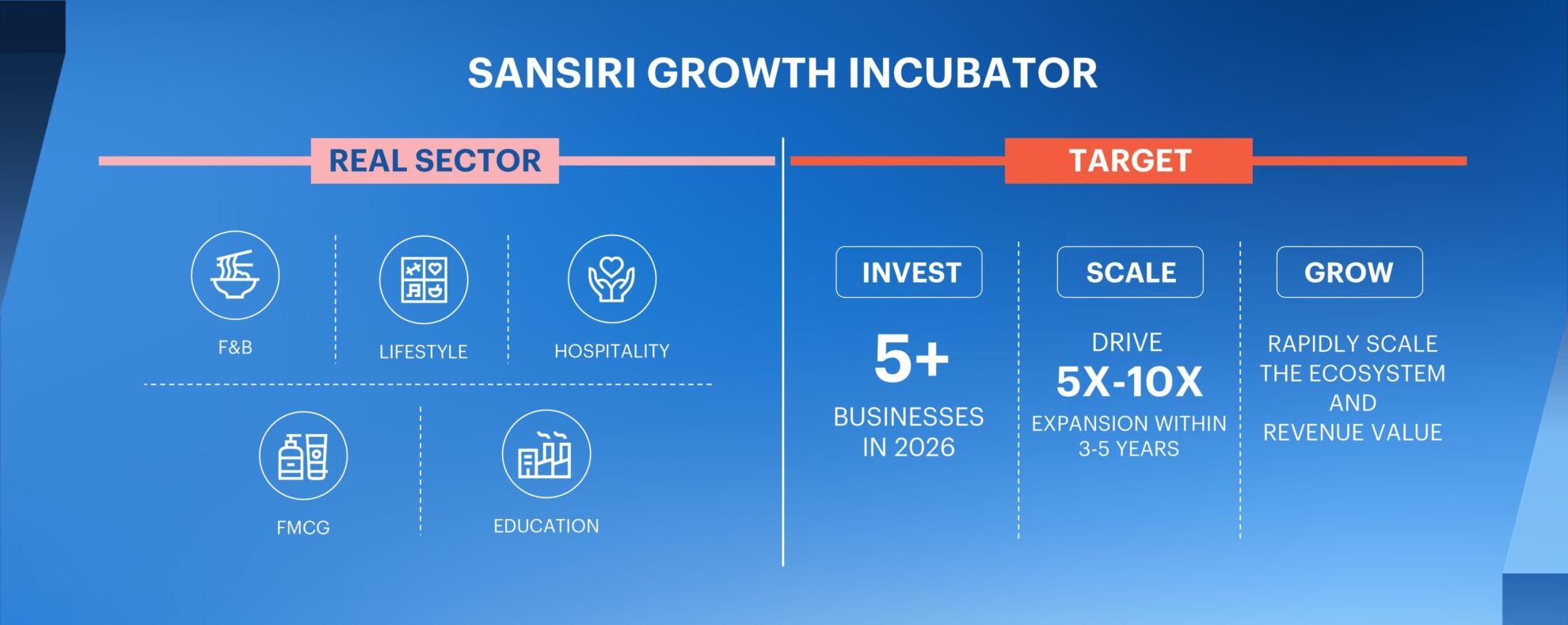 แนวคิดของ 2 ผู้บริหารหนุ่มไฟแรง ณภัทร ทวีสิน กรรมการผู้จัดการ International Operations และ ศุภกร คงสมจิตต์ ผู้อำนวยการฝ่าย Special Projects & Investment บริษัท แสนสิริ จำกัด (มหาชน) เล่าถึงการจัดตั้งหน่วยธุรกิจเชิงกลยุทธ์ใหม่ในชื่อ “SANSIRI GROWTH INCUBATOR” พร้อมทุ่มงบลงทุน 1,000 ล้านบาท ที่จะทยอยลงทุน 3 ปี ผ่าน 5 กลุ่มธุรกิจที่ แสนสิริ มองว่าจะเป็นกลุ่มที่มีศักยภาพและ Potential สูง โดยจะเป็นการเข้าไปลงทุนเป็นหุ้นส่วนตั้งแต่ 10% ขึ้นไป แต่ไม่เกิน 50% มองหาพาร์ทเนอร์กลุ่มธุรกิจที่มี DNA เดียวกันกับแสนสิริ ที่พร้อมจะ Support ทั้งเงินทุนและ Know how เสริมแกร่งผู้ประกอบการด้วยกลยุทธ์ Invest, Scale, Grow ให้เติบโตอย่างก้าวกระโดด 5-10 เท่า ภายใน 3-5 ปี