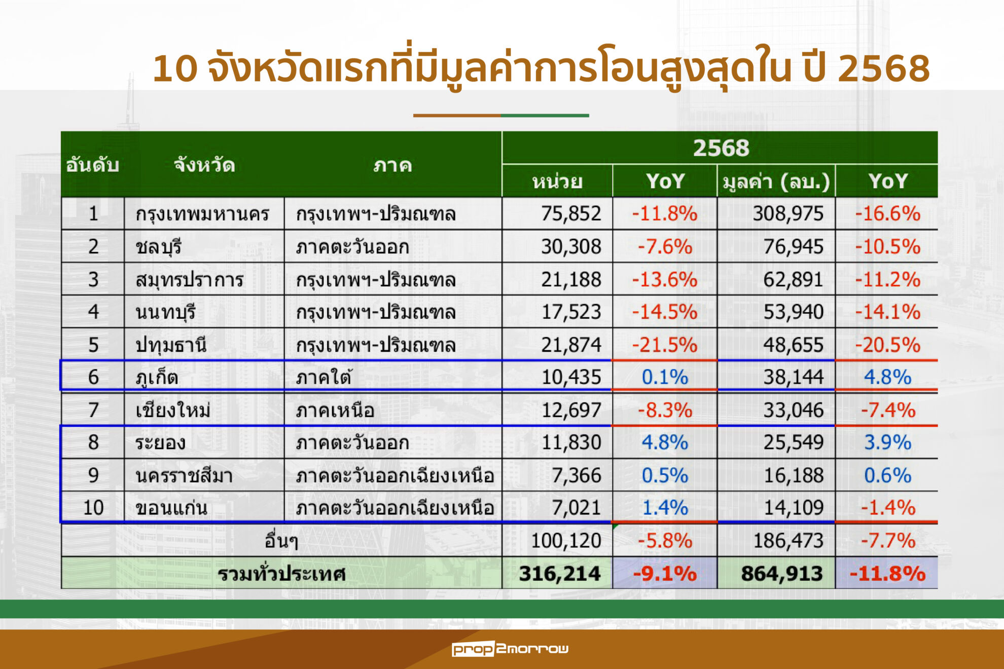 สำหรับ10 จังหวัดแรกที่มีมูลค่าการโอนสูงสุดในไตรมาส 4 ประกอบด้วย กรุงเทพฯ ชลบุรี สมุทรปราการ นนทบุรี ปทุมธานี ภูเก็ต เชียงใหม่ ระยอง ขอนแก่น และนครราชสีมา ส่วนจังหวัดที่มีการขยายตัวของการโอนเพิ่มขึ้นจากไตรมาสเดียวกันของปีก่อนทั้งจำนวนหน่วย และมูลค่า ได้แก่ ขอนแก่น และระยอง แต่หากพิจารณา 10 จังหวัดที่มีมูลค่าโอนสูงสุดในปี 2568 ประกอบด้วย กรุงเทพฯ ชลบุรี สมุทรปราการ นนทบุรี ปทุมธานี ภูเก็ต เชียงใหม่ ระยอง นครราชสีมา และขอนแก่น