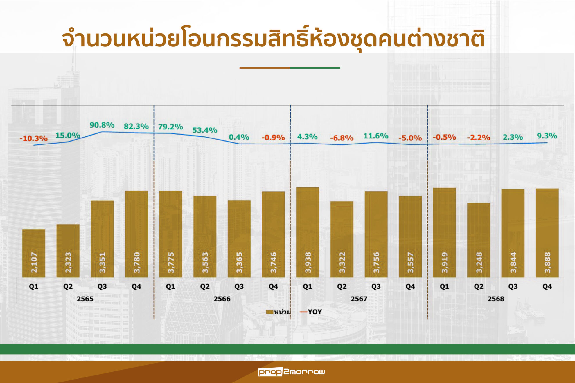 - ปี 2568 ชาวต่างชาติโอนกรรมสิทธิ์ห้องชุด 14,899 ยูนิต เพิ่มขึ้น 2% จากปีก่อนหน้า ขณะที่มูลค่าการโอนอยู่ที่ 60,921 ล้านบาท ลดลง -10.7% ชาวจีนครองตำแหน่งผู้ซื้อหลักมียอดโอนกรรมสิทธิ์ 4,940 ยูนิต ลดลง -12.9% จากปีก่อน