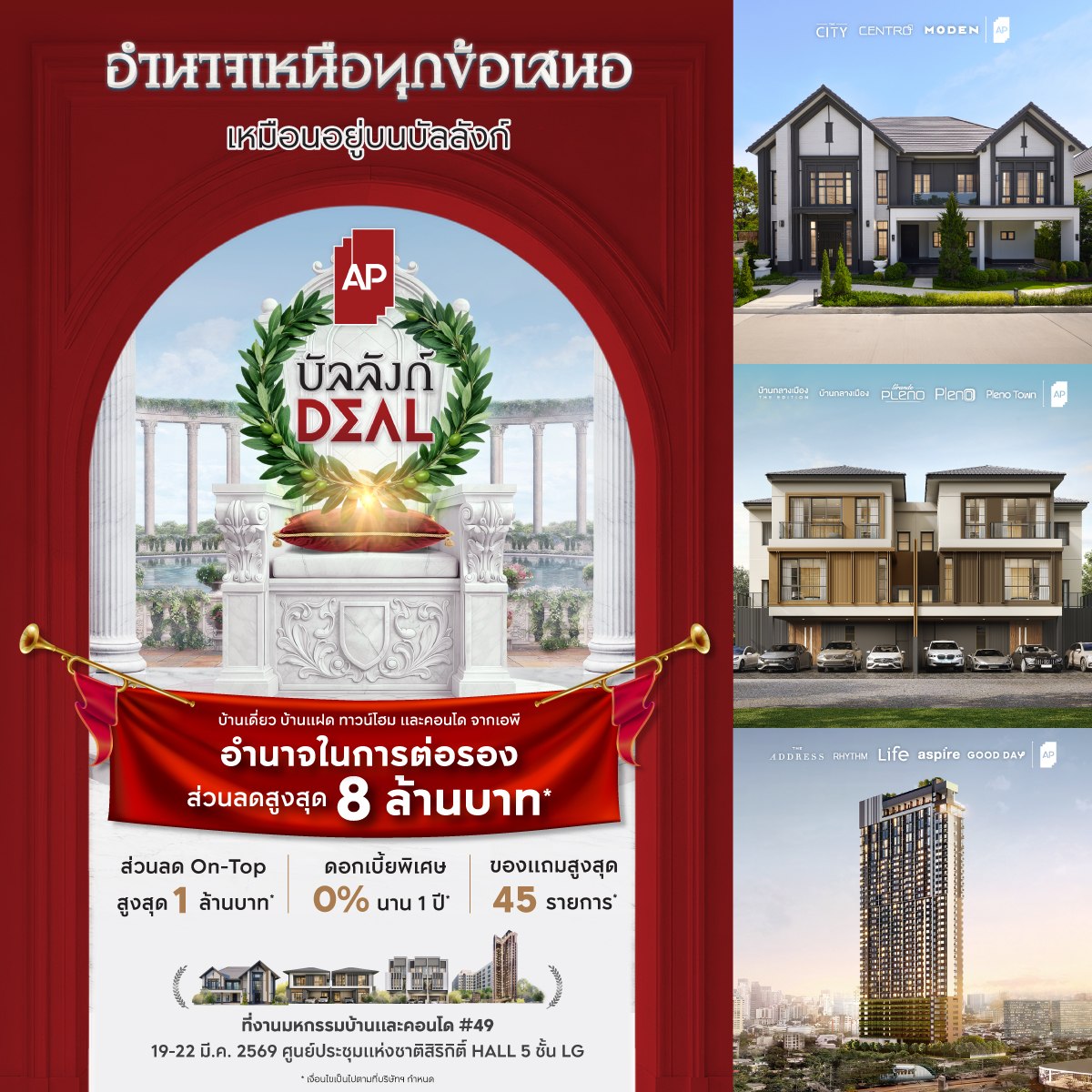 เอพี ไทยแลนด์ เปิดตัวแคมเปญ “บัลลังก์ DEAL” ในงานมหกรรมบ้านและคอนโด ครั้งที่ 49 ขนทัพโครงการคุณภาพในเครือเอพี ทั้งบ้านเดี่ยว บ้านแฝด ทาวน์โฮม และคอนโดมิเนียม รวมกว่า 180 โครงการใหม่และโครงการพร้อมเข้าอยู่ ในระดับราคา 1.49 – 50 ล้านบาท* บนทำเลศักยภาพทั่วกรุงเทพฯ มาไว้ในงานเดียว พร้อมสร้างปรากฏการณ์ “บัลลังก์ DEAL” ไฮไลต์สำคัญ “มอบอำนาจการตัดสินใจ” ให้ลูกค้าเป็นผู้เลือกรับข้อเสนอที่คุ้มค่าที่สุดด้วยตนเอง พร้อมข้อเสนอพิเศษ อาทิ