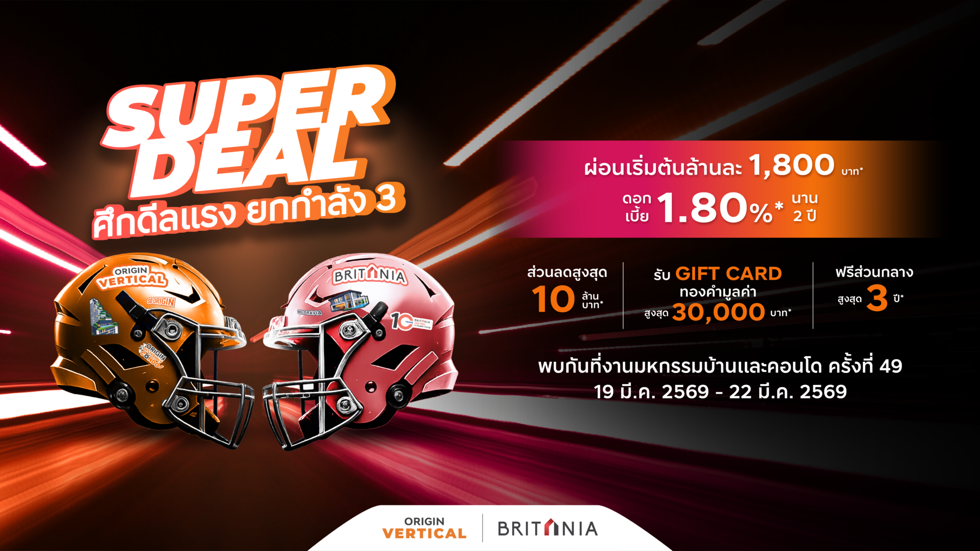 ออริจิ้น เวอร์ติเคิล – บริทาเนีย แทคทีมเปิดสนาม แคมเปญ “Super Deal ศึกดีลแรง ยกกำลัง 3” นำทัพคอนโด บ้านเดี่ยว บ้านแฝด ทาวน์โฮม หลากหลายแบรนด์รวม 77 โครงการทั่วประเทศ เปิดสนามมอบดีลใหญ่ให้กับผู้ที่กำลังหาคอนโดฯและบ้าน อัดโปรแรง ลดสูงสุด 10 ล้านบาท* ปิดดีลรับโบนัส Gift Card ทองคำ มูลค่าสูงสุด 30,000 บาท* พร้อมจับมือพันธมิตรธนาคารชั้นนำ ปล่อยดอกเบี้ยพิเศษ 1.80%* ผ่อนเริ่มต้นล้านละ 1,800 บาท* นาน 2 ปี จากธนาคารพาณิชย์ชั้นนำ อีกทั้งยังเอาใจสายบันเทิง ฟรี! ทรูวิชั่นส์ เอนเตอร์เทนเม้นท์ 12 เดือน* สำหรับลูกค้าที่จดทะเบียนรับโอนกรรมสิทธิ์ 50 ท่านแรก* ในงานมหกรรมบ้านและคอนโด ครั้งที่ 49 วันที่ 19-22 มีนาคม 2569 เท่านั้น