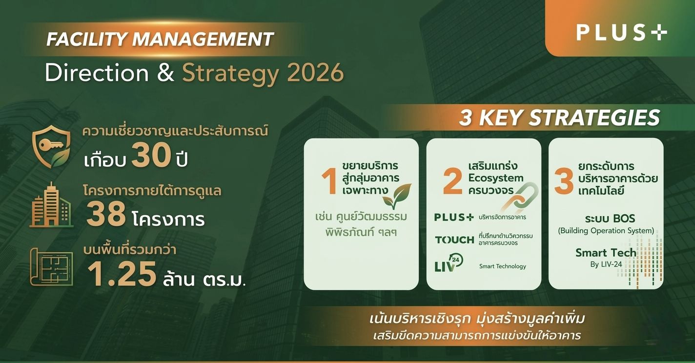 - พลัส พร็อพเพอร์ตี้เปิดแผนปี 2569 ลุยธุรกิจ Facility Management ยกระดับมาตรฐานการบริหารอาคารเชิงพาณิชย์ ครอบคลุมการบริหารจัดการ ระบบอาคาร และประสบการณ์ของผู้ใช้อาคาร