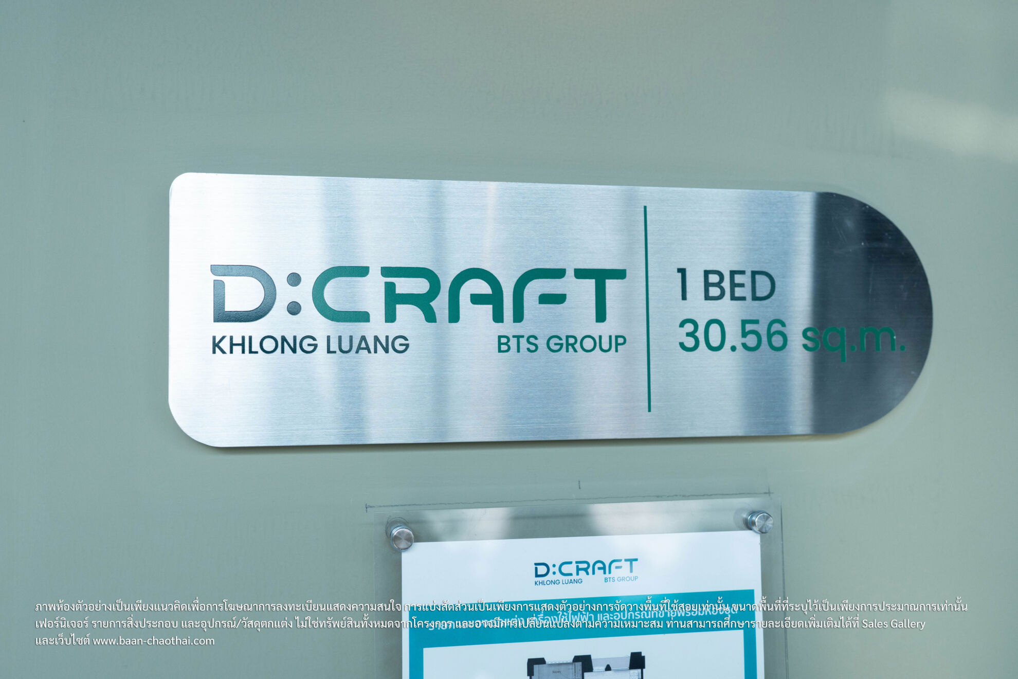 โดยในพื้นที่ Sales Gallery D:CRAFT KHLONG LUANG ได้จัดแสดงห้องตัวอย่าง 3 แบบ ได้แก่ ขนาด 30 ตารางเมตร แบบ 1 ห้องนอน 1 ห้องน้ำ ครัวเปิด ราคาเริ่มต้น 1,600,000 บาท, ขนาด 45 ตารางเมตร 2 ห้องนอน 2 ห้องน้ำ ครัวเปิดราคาเริ่มต้น 2,400,000 บาท และขนาด 60 ตารางเมตรแบบ 3 ห้องนอน 2 ห้องน้ำ ครัวเปิดที่สามารถเพิ่มเติมเป็นครัวปิดได้ ราคาเริ่มต้น 3,200,000 บาท พร้อมของตกแต่งมีทั้งเครื่องใช้ไฟฟ้า เคาน์เตอร์ครัว พร้อมอ่างล้างจาน, โต๊ะทานอาหาร เก้าอี้ทานอาหาร, โซฟา, โต๊ะกาแฟ, เตียง,ที่นอนและหมอน, ตู้เสื้อผ้า, โต๊ะข้างเตียง, โต๊ะแต่งตัว, เก้าอี้แต่งตัว, ตู้เย็น, เครื่องปรับอากาศ, โทรทัศน์, เครื่องซักผ้า, เครื่องดูดควัน, เตาไฟฟ้า, ไมโครเวฟ, โคมไฟแขวน, ผ้าม่าน และระบบ Smart Home โดยรายการและจำนวนจะขึ้นอยู่กับขนาดของห้องชุด