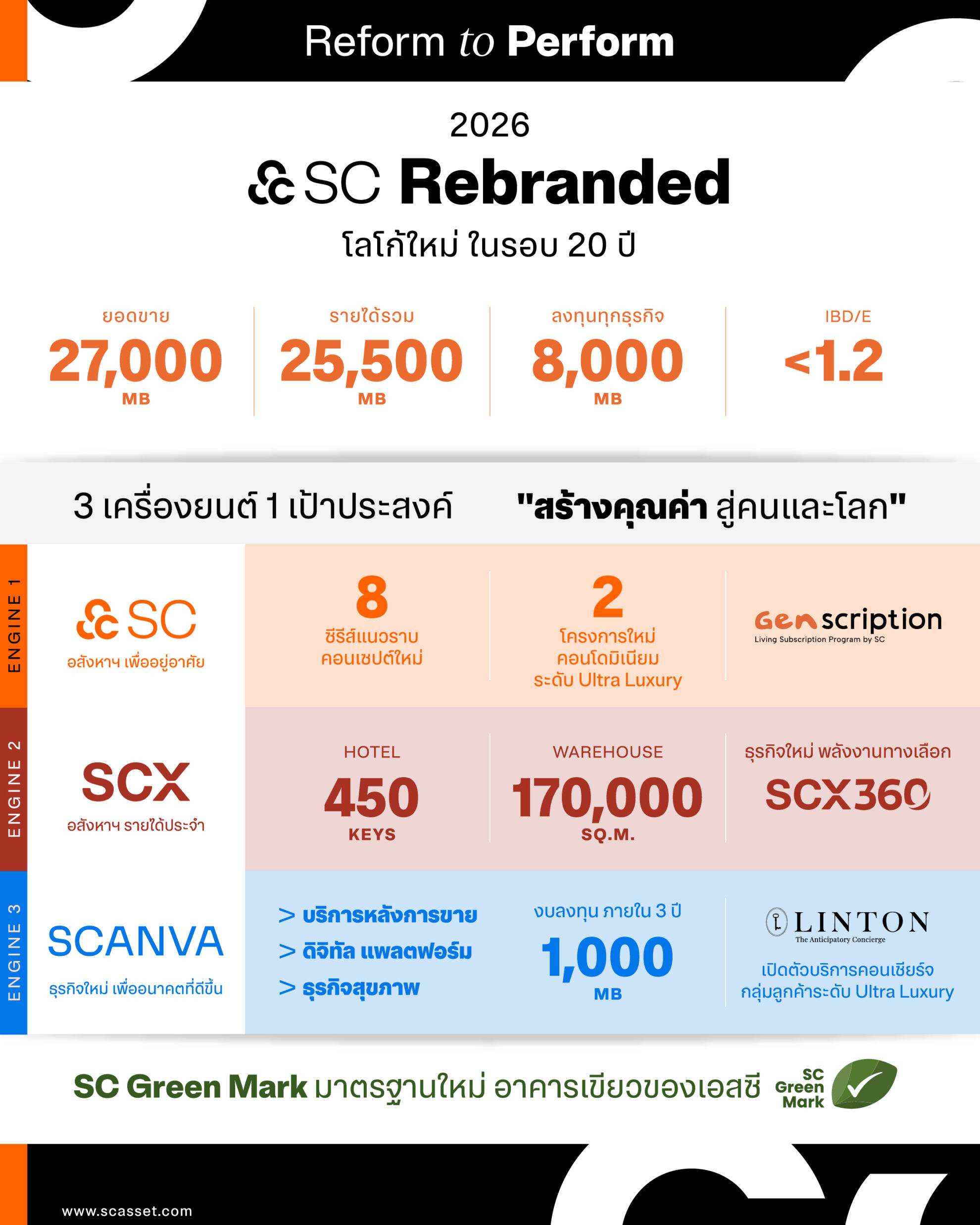 ในเชิงโครงสร้างธุรกิจ SC ปรับตัวมาอย่างต่อเนื่องในช่วง 2-3 ปีที่ผ่านมา ผ่านแนวคิด 3 Engines ที่บริษัท เริ่มขับเคลื่อนอย่างจริงจัง โดยเฉพาะ Engine 2 อสังหาฯ รายได้ประจำ ที่เริ่มสร้างภาพของรายได้ประจำที่ชัดขึ้น ผ่านการพัฒนาธุรกิจโรงแรม ธุรกิจคลังสินค้า อาคารสำนักงาน และ อพาร์ตเมนต์ให้เช่าใน U.S. ภายใต้ SCX Corporation ในขณะที่ Engine 3 ธุรกิจใหม่ เพื่ออนาคตที่ดีขึ้น ก็มีความชัดเจนขึ้นอย่างมากในปีนี้ ผ่านการเปิดตัว “SCANVA” เป็นครั้งแรก ในฐานะกลุ่มธุรกิจที่เชื่อมต่อ Ecosystem ของการใช้ชีวิต ครอบคลุมธุรกิจบริการหลังการขายในชีวิตประจำวันไปจนถึงบริการระดับพรีเมียม ดิจิทัล แพลตฟอร์ม และสุขภาพ ซึ่งมีการตั้งเป้าหมายต่างๆ ที่เป็นรูปธรรม สะท้อนความพยายามในการขยับจากธุรกิจที่พึ่งพาการขายโครงการ ไปสู่การสร้างโครงสร้างรายได้ที่หลากหลายและสมดุลมากขึ้น ทั้งนี้การขับเคลื่อนครั้งนี้จะเป็นอีกหนึ่งจุดเปลี่ยนสำคัญ โดยคาดว่าจะเห็นการเปิดตัวธุรกิจใหม่อย่างต่อเนื่อง ควบคู่กับการขยายพอร์ตของ Engine 2 และ 3 ผ่านการร่วมทุน (JV) เพื่อเร่งการเติบโต และสร้างสมดุลของรายได้ในระยะยาว