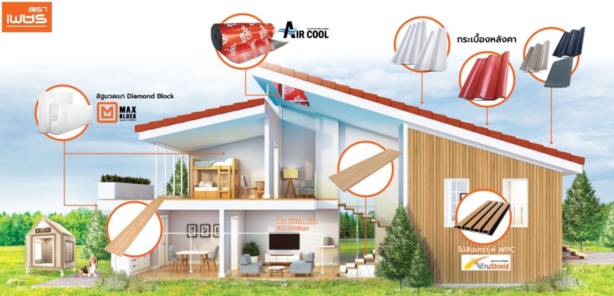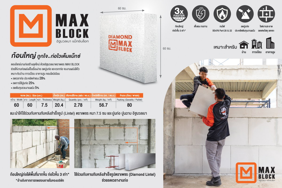 กลุ่มผนัง อาทิ อิฐมวลเบา G2 สำหรับบ้านและทาวน์โฮม และอิฐมวลเบา G4 สำหรับคอนโดมิเนียมและอาคารสูง ผ่านมาตรฐาน มอก. 1505-2541 ความหนา 7.5 – 20 เซนติเมตร ช่วยป้องกันความร้อนเข้าสู่ภายในอาคารได้ดีกว่าอิฐมอญ รวมถึงลดเสียงรบกวนจากภายนอก, อิฐมวลเบา MAX BLOCK ขนาด 60x60x7.5 ซม. นวัตกรรมเพื่อการก่อสร้างที่รวดเร็วขึ้น 3 เท่า ลดเวลาลดค่าแรง ลดปริมาณปูนก่อ ลดต้นทุนงานก่อผนังได้, ผนังตกแต่ง SPC Fast Panel รอยต่อแนบสนิท ทำความสะอาดง่าย ไม่ต้องยาแนว และกลุ่มวัสดุตกแต่งพื้นและบันได อาทิ แผ่นพื้น SPC และไม้บันได SPC สำหรับใช้งานภายใน พื้นผิวสัมผัสกันลื่นระดับ R10 และไม่ปล่อยสารเคมีอันตราย, ไม้สังเคราะห์ Diamond XTruShield WPC สำหรับใช้งานภายนอก อายุการใช้งานยาวนาน เป็นมิตรต่อสิ่งแวดล้อม