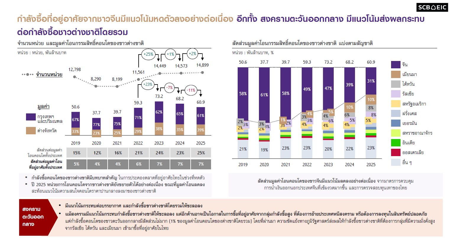 ด้าน SCB EIC ให้ความเห็นว่า ภาระหนี้สิน ค่าใช้จ่ายที่เพิ่มขึ้นเร็วกว่ารายได้ และการให้สินเชื่อของสถาบันการเงินที่เข้มงวดต่อเนื่องจากปี 2568 อีกทั้ง สงครามตะวันออกกลางมีแนวโน้มซ้ำเติมกำลังซื้อให้ฟื้นตัวได้ยากมากขึ้น โดยกรณีสงครามยืดเยื้อ มีความเสี่ยงหดตัว 10% ถึง 15% (YoY) และส่งผลต่อการลดลงของอุปทานใหม่ ทำให้หน่วยเหลือขายสะสมในกรุงเทพฯ-ปริมณฑลปี 2569 มีแนวโน้มลดลงต่อเนื่องเป็นปีที่ 2 มาอยู่ที่ราว 212,000 หน่วย (-4%YOY) ทั้งนี้การเปิดตัวโครงการใหม่ต้องเตรียมรับมือกับภาวะต้นทุนวัสดุก่อสร้างพุ่งสูงขึ้น จากสงครามตะวันออกกลาง ขณะที่กำลังซื้อยังไม่สามารถฟื้นตัวได้ กดดันให้ผู้ประกอบการไม่สามารถปรับขึ้นราคาที่อยู่อาศัยได้มากนัก และกระทบต่ออัตรากำไรตามมา