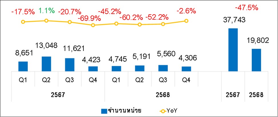 ด้านข้อมูลการเปิดขายโครงการที่อยู่อาศัยใหม่ในกรุงเทพฯ – ปริมณฑลทั้งปี 2568 มีจำนวน 252 โครงการเท่านั้น ลดลง–30% มีจำนวนหน่วยในผังรวม 32,887 ยูนิต ลดลง–47.2% มูลค่าโครงการรวม 253,720 ล้านบาท ลดลง–49% เมื่อเทียบกับช่วงเดียวกันของปีก่อน โดยบ้านจัดสรรเปิดขายใหม่จำนวน 13,890 ยูนิต ลดลง–57.2% มูลค่ารวม 151,097 ล้านบาท ลดลง–54.7% เมื่อเทียบกับช่วงเดียวกันของปีก่อน ส่วนโครงการอาคารชุดมีจำนวนรวม 18,997 ยูนิต ลดลง–36.3% มูลค่ารวม 102,623 ล้านบาท ลดลง–37.3% เมื่อเทียบกับช่วงเดียวกันของปีก่อน